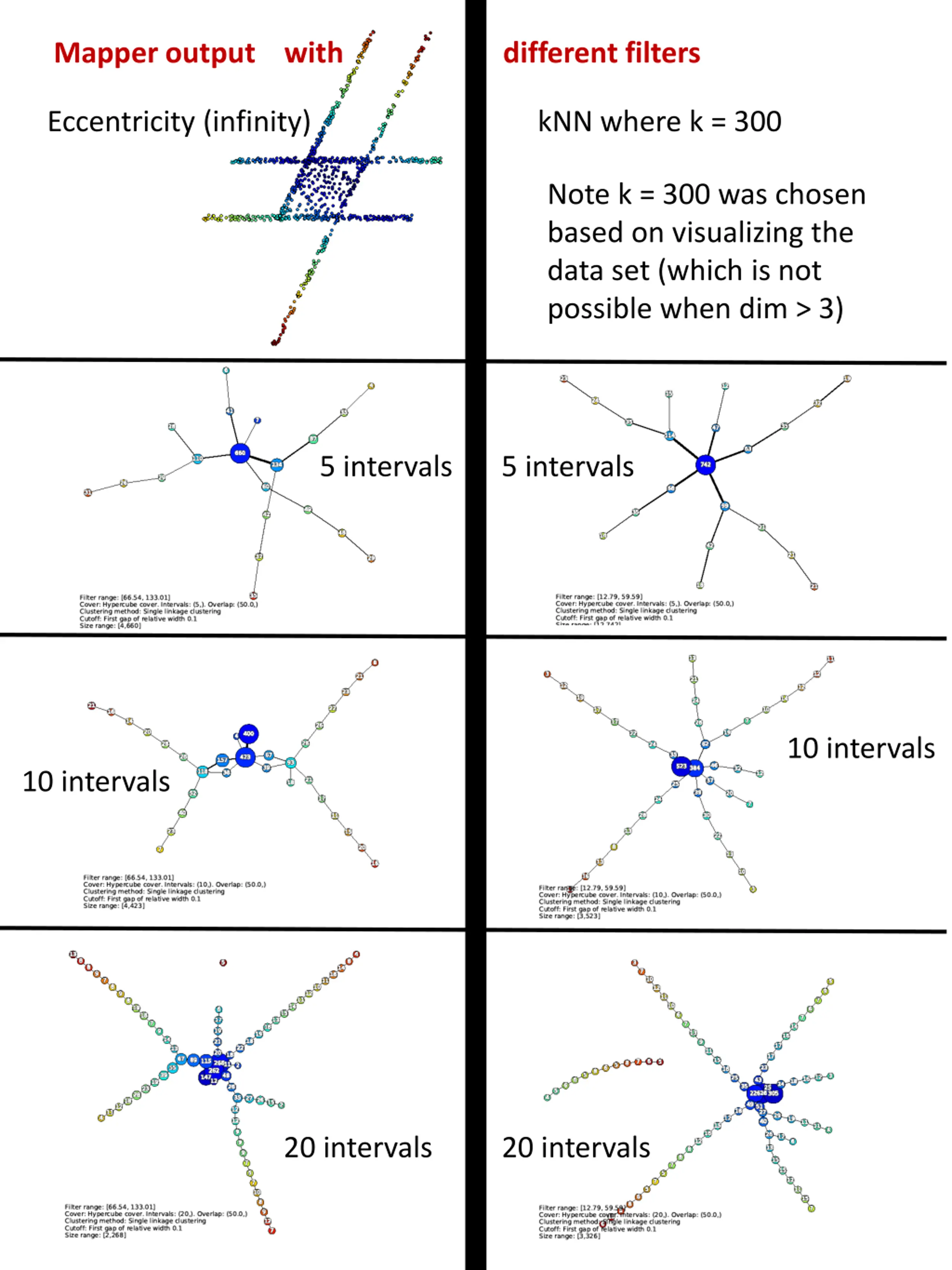 Mapper output with different filters Eccentricity (infinity) kNN where k = 300 Note k = 300 was chosen based on visualizing the data set (which is not possible when dim > 3) 5 intervals 5 intervals 10 intervals 10 intervals 20 intervals 20 intervals