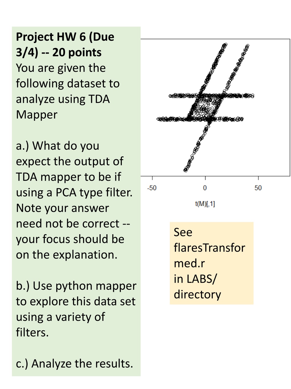 Project HW 6 (Due 3/4) -- 20 points You are given the following dataset to analyze using TDA Mapper a.) What do you expect the output of TDA mapper to be if using a PCA type filter. Note your answer need not be correct -- your focus should be on the explanation. See flaresTransfor med.r in LABS/ directory b.) Use python mapper to explore this data set using a variety of filters. c.) Analyze the results.