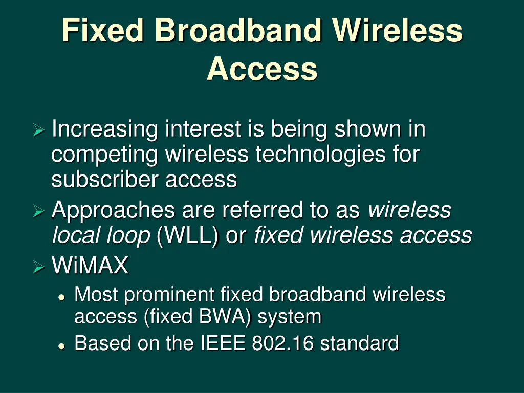 Fixed Broadband Wireless Access Increasing interest is being shown in competing wireless technologies for subscriber access Approaches are referred to as wireless local loop (WLL) or fixed wireless access WiMAX Most prominent fixed broadband wireless access (fixed BWA) system Based on the IEEE 802.16 standard