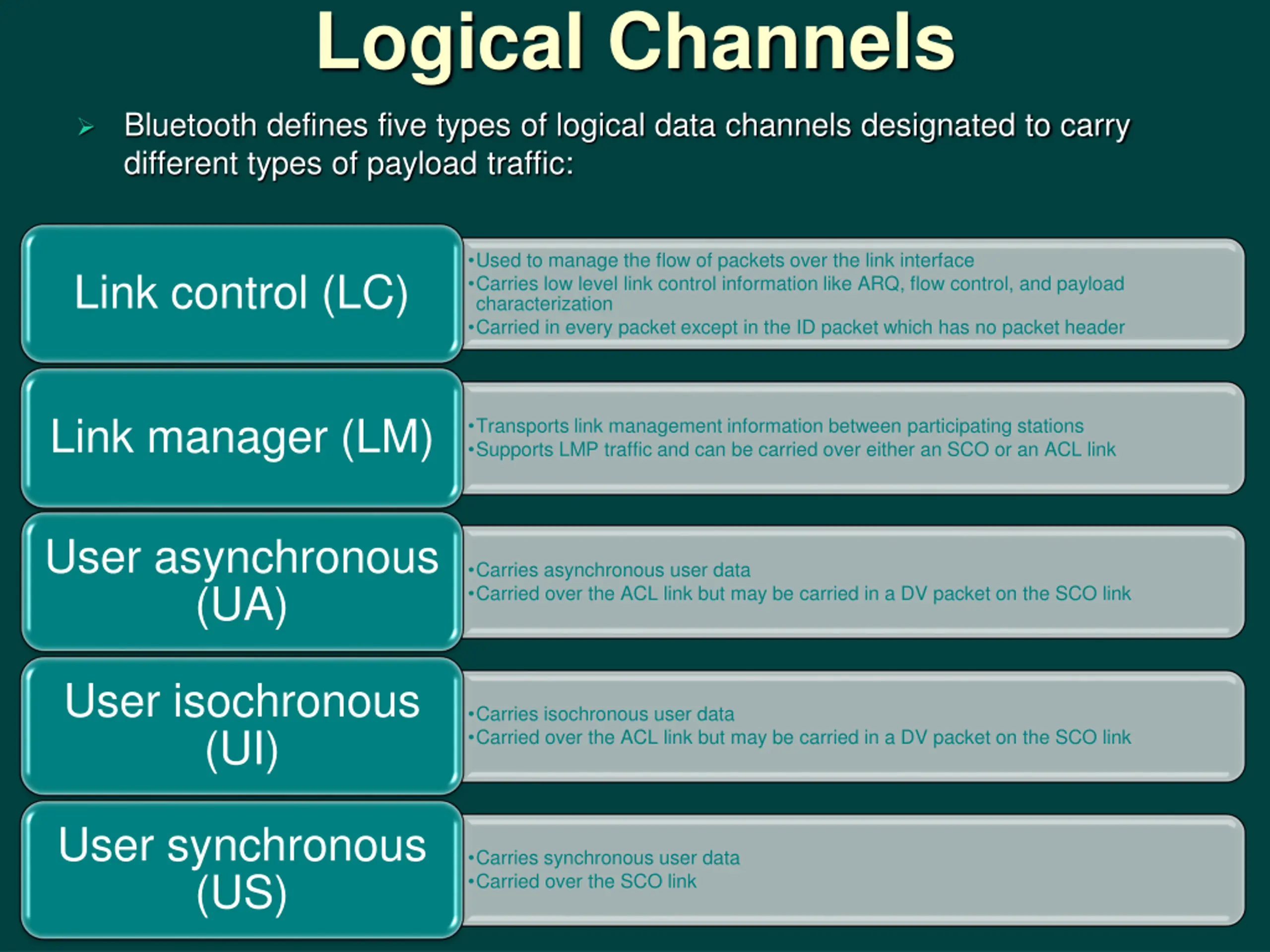 Logical Channels Bluetooth defines five types of logical data channels designated to carry different types of payload traffic: Used to manage the flow of packets over the link interface Carries low level link control information like ARQ, flow control, and payload characterization Carried in every packet except in the ID packet which has no packet header Link control (LC) Link manager (LM) Transports link management information between participating stations Supports LMP traffic and can be carried over either an SCO or an ACL link User asynchronous (UA) Carries asynchronous user data Carried over the ACL link but may be carried in a DV packet on the SCO link User isochronous (UI) Carries isochronous user data Carried over the ACL link but may be carried in a DV packet on the SCO link User synchronous (US) Carries synchronous user data Carried over the SCO link
