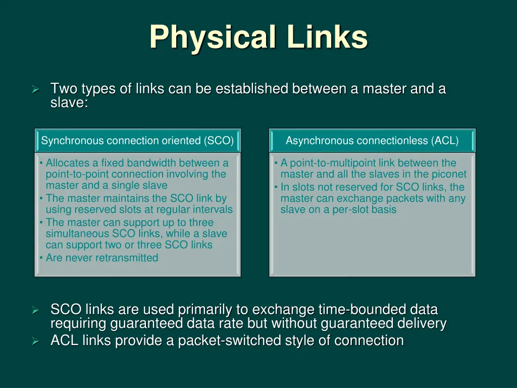 Physical Links Two types of links can be established between a master and a slave: Synchronous connection oriented (SCO) Asynchronous connectionless (ACL) Allocates a fixed bandwidth between a point-to-point connection involving the master and a single slave The master maintains the SCO link by using reserved slots at regular intervals The master can support up to three simultaneous SCO links, while a slave can support two or three SCO links Are never retransmitted A point-to-multipoint link between the master and all the slaves in the piconet In slots not reserved for SCO links, the master can exchange packets with any slave on a per-slot basis SCO links are used primarily to exchange time-bounded data requiring guaranteed data rate but without guaranteed delivery ACL links provide a packet-switched style of connection