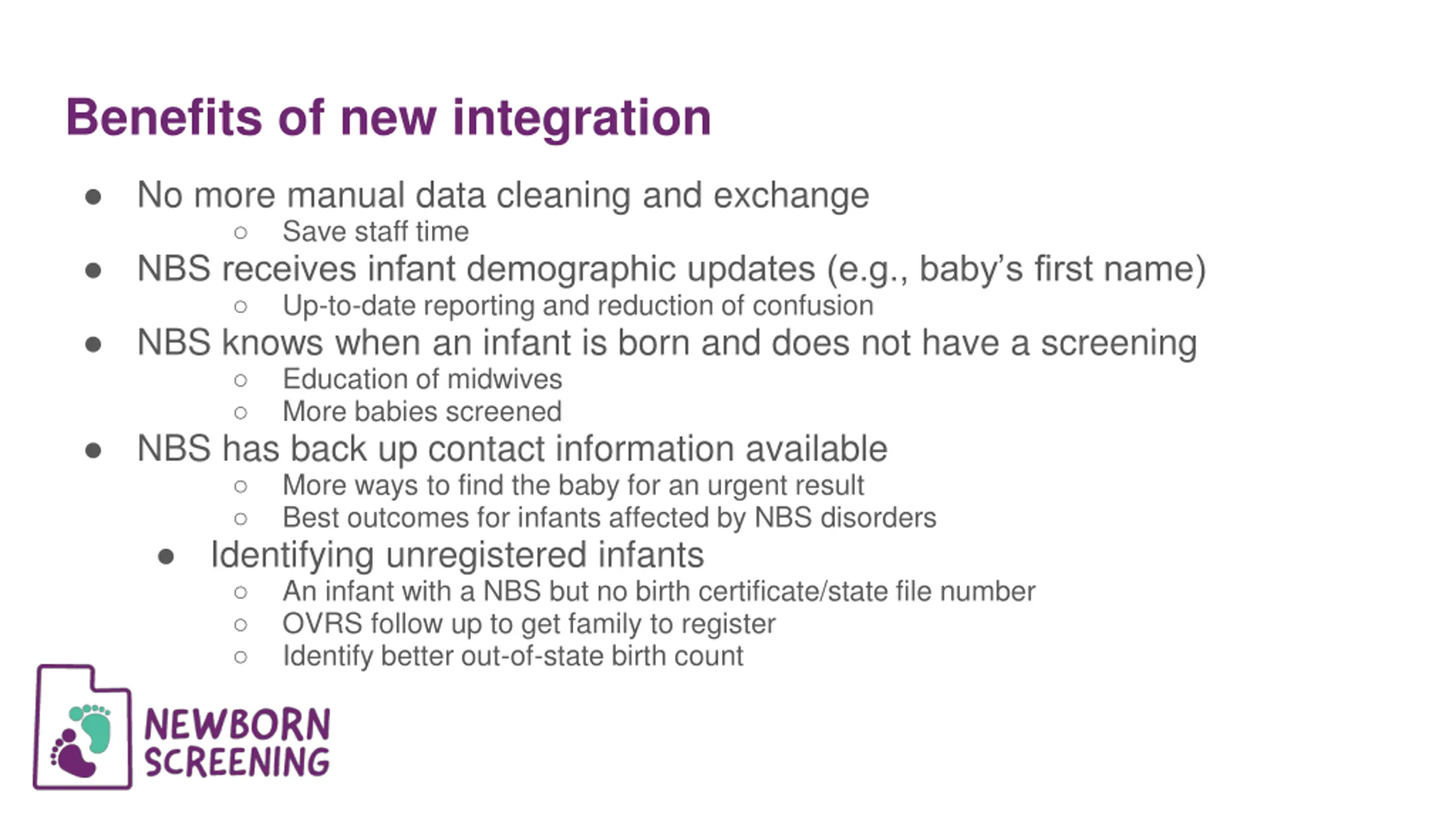 Benefits of new integration No more manual data cleaning and exchange Save staff time NBS receives infant demographic updates (e.g., baby s first name) Up-to-date reporting and reduction of confusion NBS knows when an infant is born and does not have a screening Education of midwives More babies screened NBS has back up contact information available More ways to find the baby for an urgent result Best outcomes for infants affected by NBS disorders Identifying unregistered infants An infant with a NBS but no birth certificate/state file number OVRS follow up to get family to register Identify better out-of-state birth count