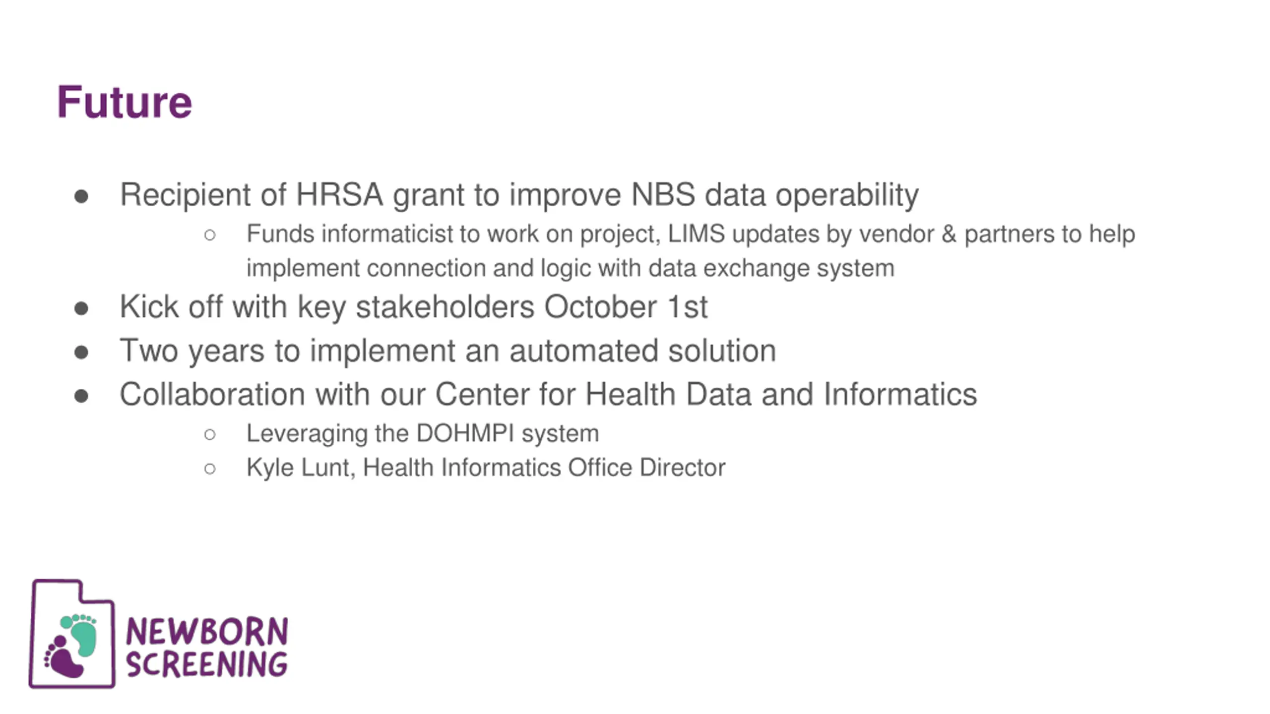 Future Recipient of HRSA grant to improve NBS data operability Funds informaticist to work on project, LIMS updates by vendor & partners to help implement connection and logic with data exchange system Kick off with key stakeholders October 1st Two years to implement an automated solution Collaboration with our Center for Health Data and Informatics Leveraging the DOHMPI system Kyle Lunt, Health Informatics Office Director