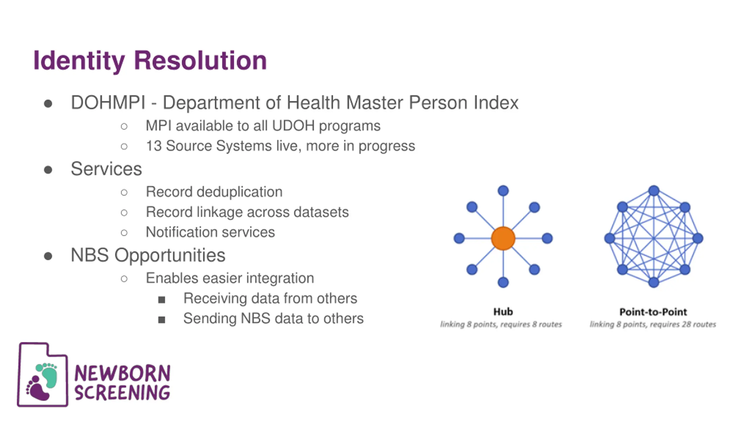Identity Resolution DOHMPI - Department of Health Master Person Index MPI available to all UDOH programs 13 Source Systems live, more in progress Services Record deduplication Record linkage across datasets Notification services NBS Opportunities Enables easier integration Receiving data from others Sending NBS data to others