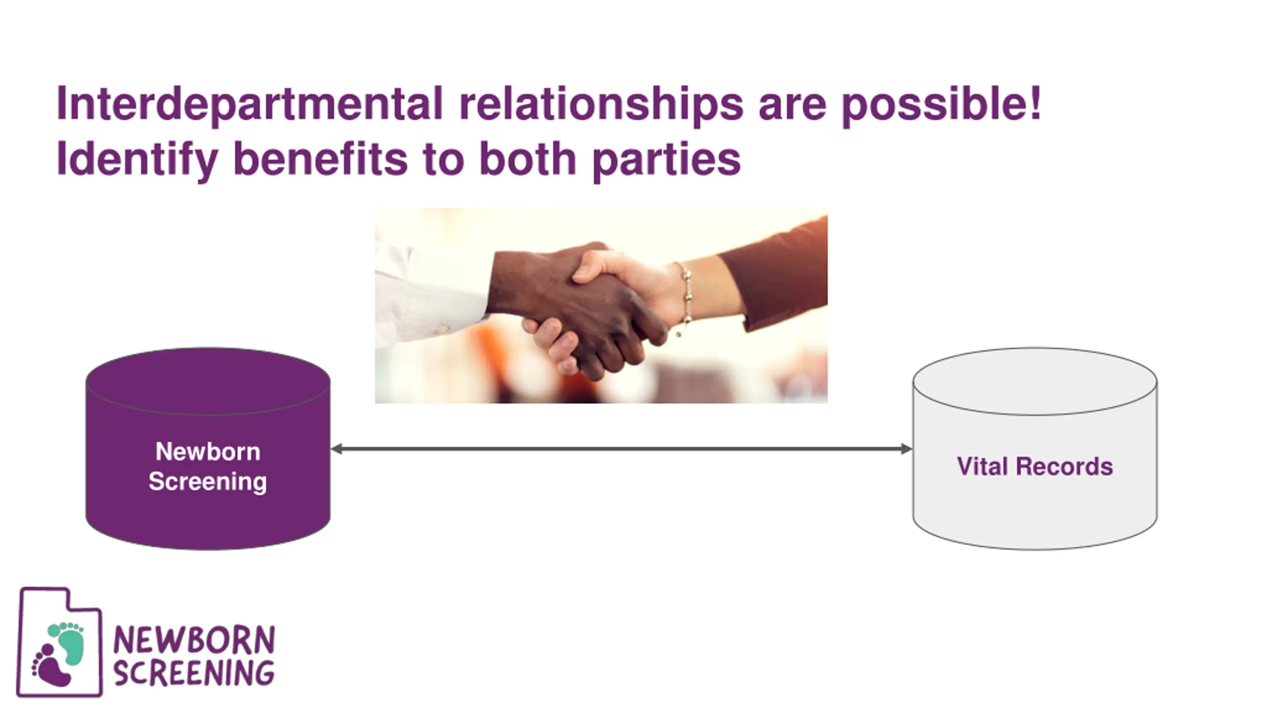 Interdepartmental relationships are possible! Identify benefits to both parties Newborn Screening Vital Records