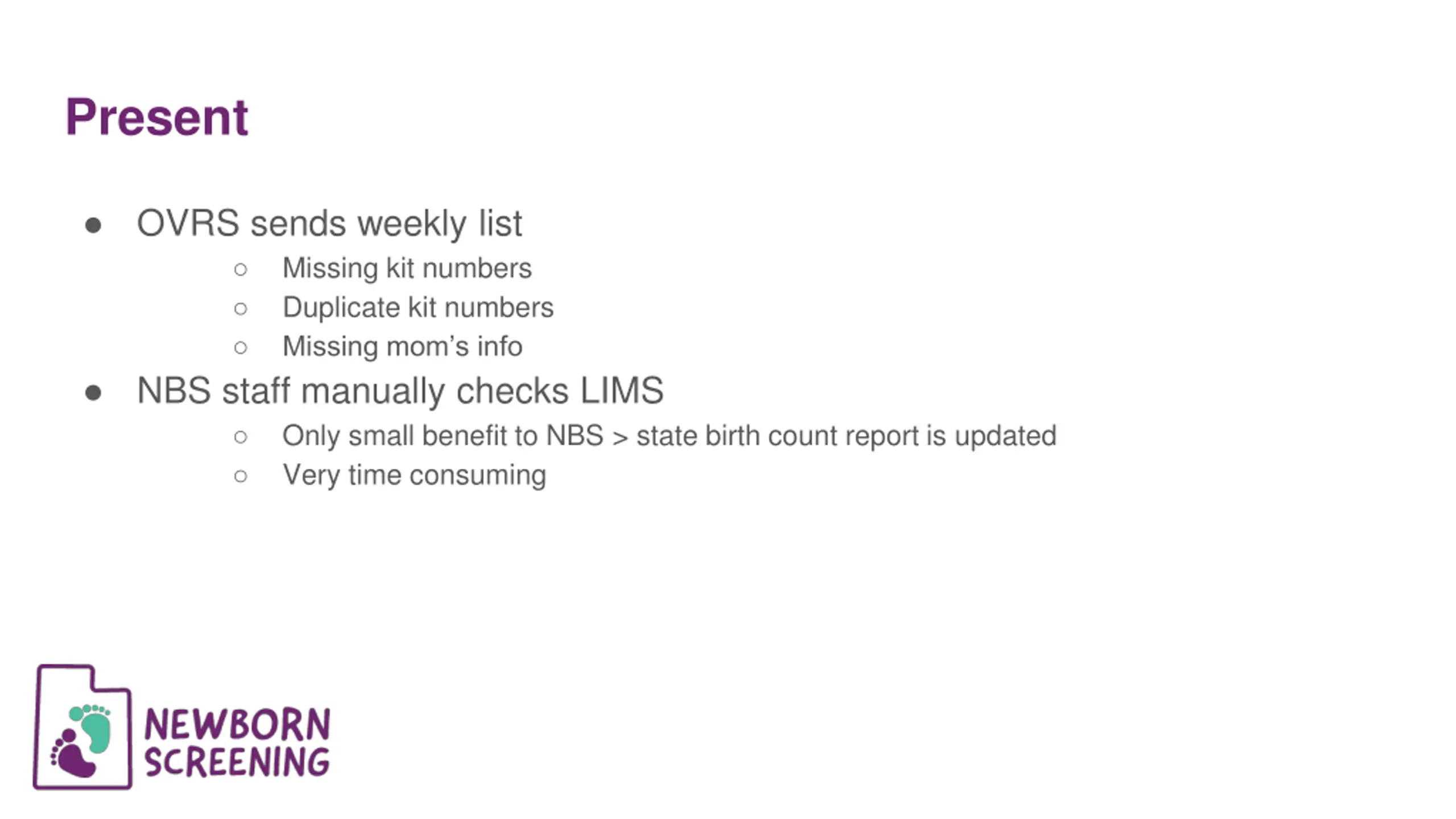 Present OVRS sends weekly list Missing kit numbers Duplicate kit numbers Missing mom s info NBS staff manually checks LIMS Only small benefit to NBS > state birth count report is updated Very time consuming