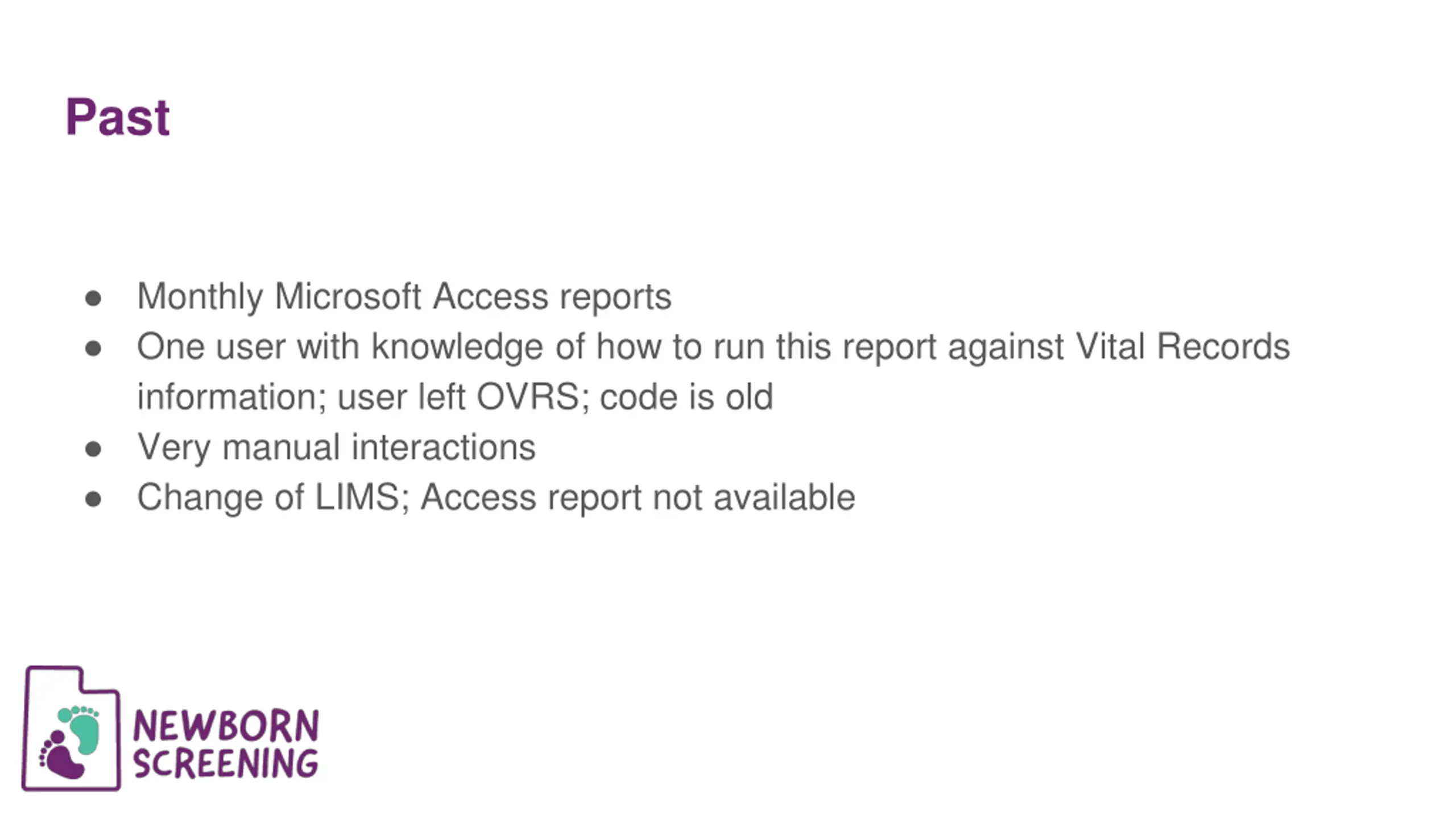 Past Monthly Microsoft Access reports One user with knowledge of how to run this report against Vital Records information; user left OVRS; code is old Very manual interactions Change of LIMS; Access report not available