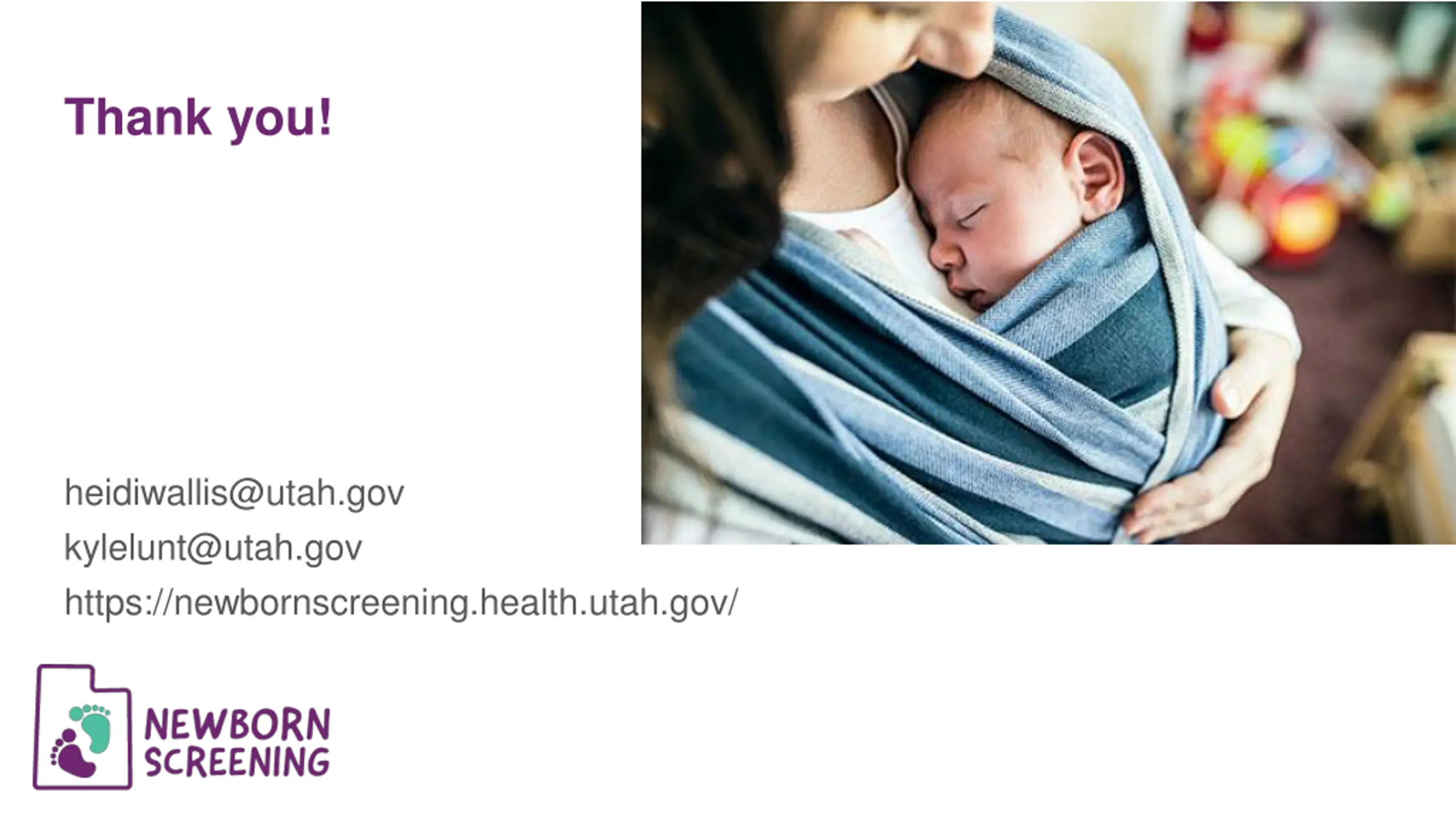 Thank you! heidiwallis@utah.gov kylelunt@utah.gov https://newbornscreening.health.utah.gov/