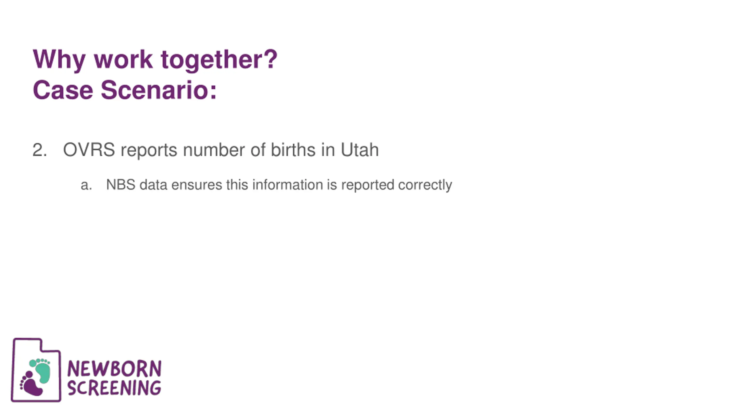 Why work together? Case Scenario: 2. OVRS reports number of births in Utah a. NBS data ensures this information is reported correctly