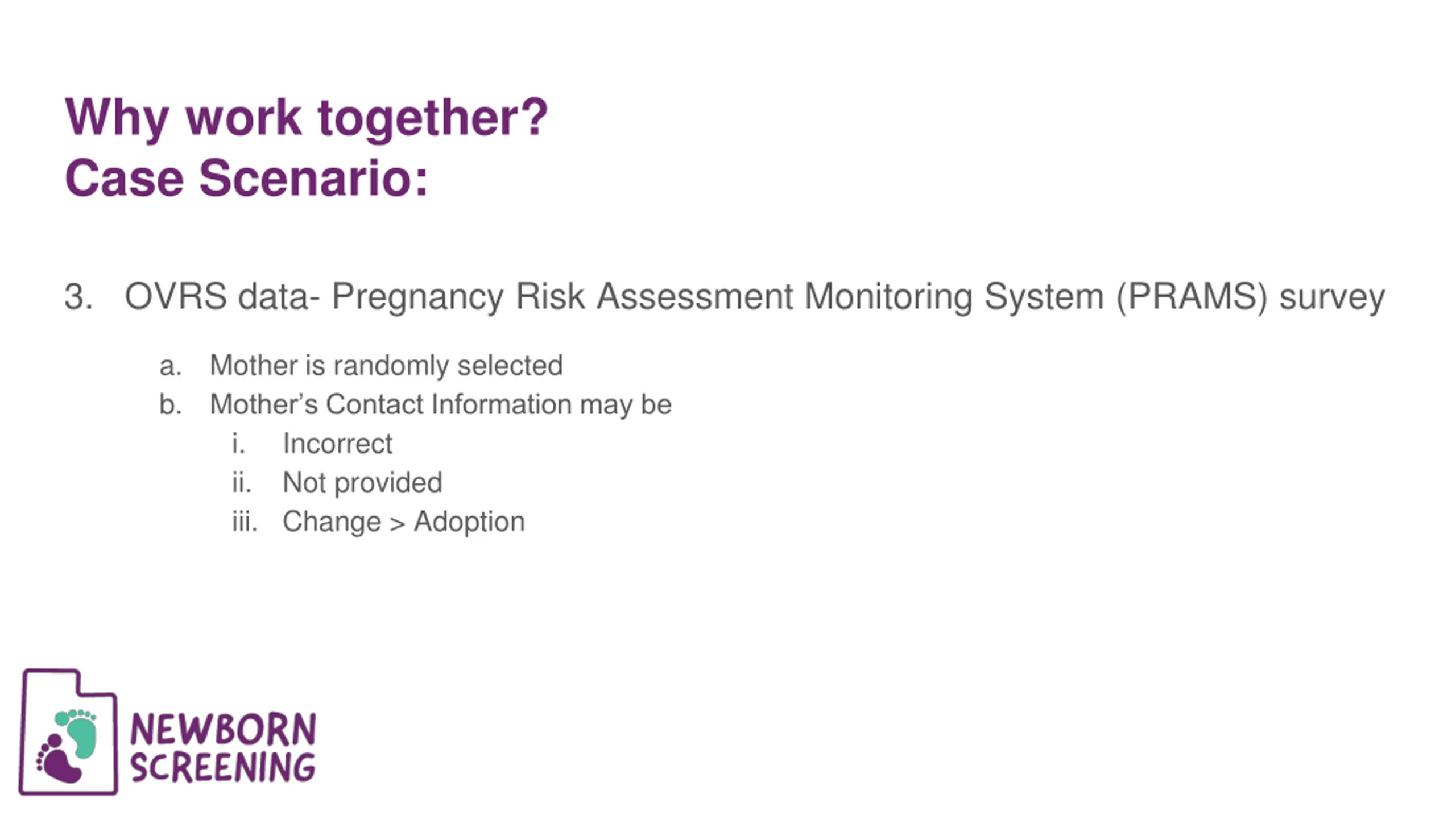 Why work together? Case Scenario: 3. OVRS data- Pregnancy Risk Assessment Monitoring System (PRAMS) survey a. b. Mother is randomly selected Mother s Contact Information may be i. Incorrect ii. Not provided iii. Change > Adoption