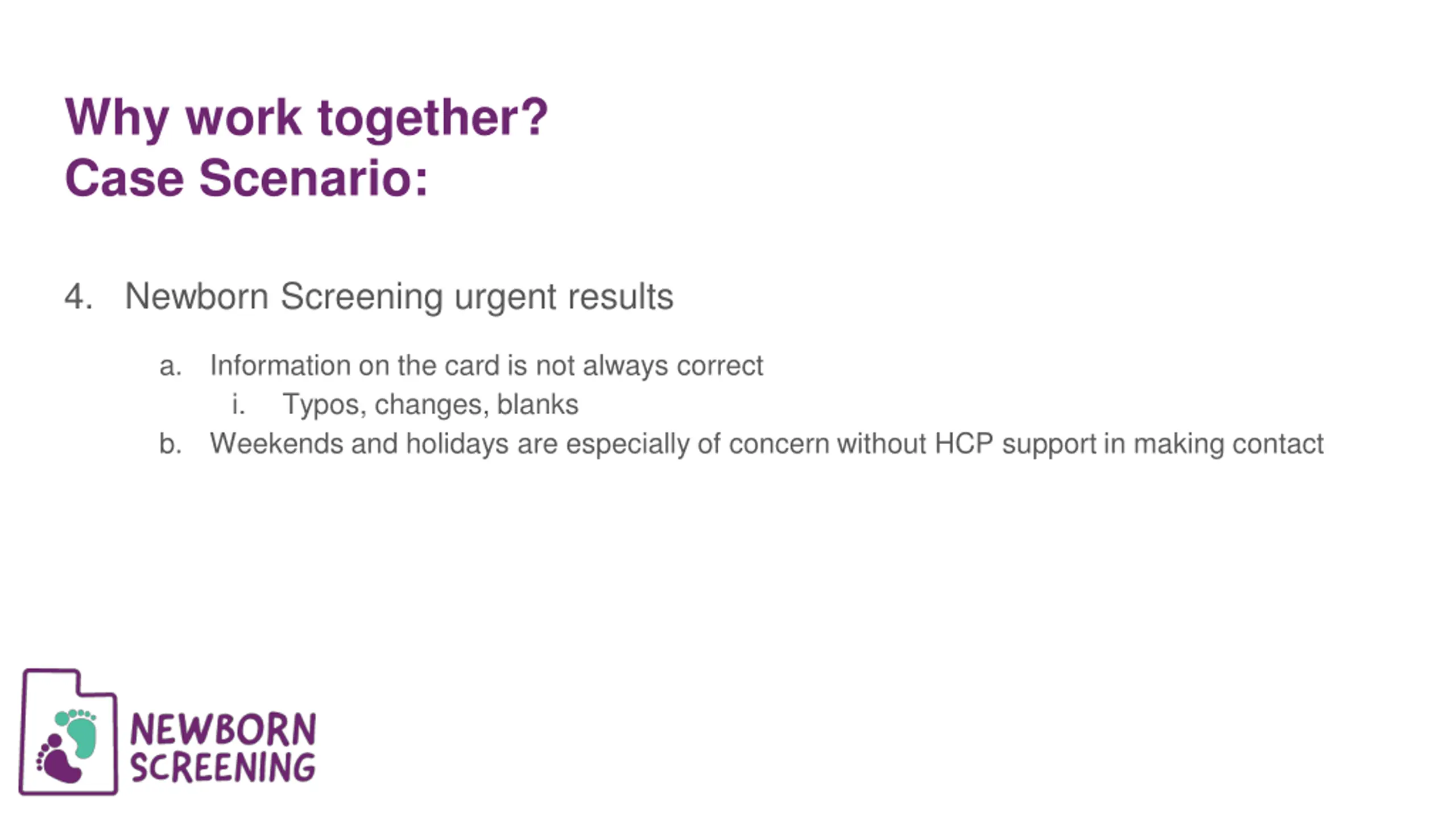 Why work together? Case Scenario: 4. Newborn Screening urgent results a. Information on the card is not always correct i. Typos, changes, blanks Weekends and holidays are especially of concern without HCP support in making contact b.