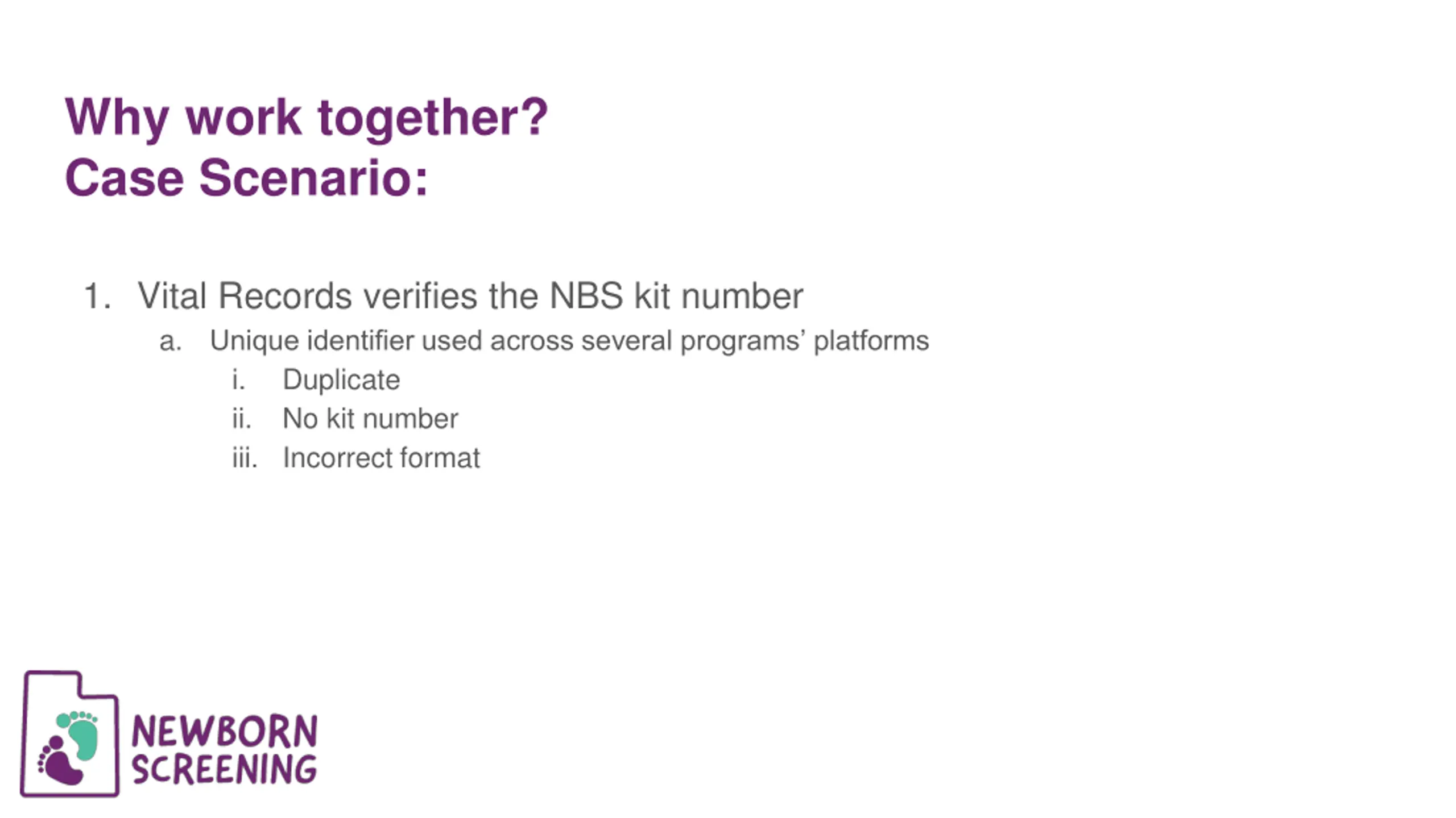 Why work together? Case Scenario: 1. Vital Records verifies the NBS kit number a. Unique identifier used across several programs platforms i. Duplicate ii. No kit number iii. Incorrect format