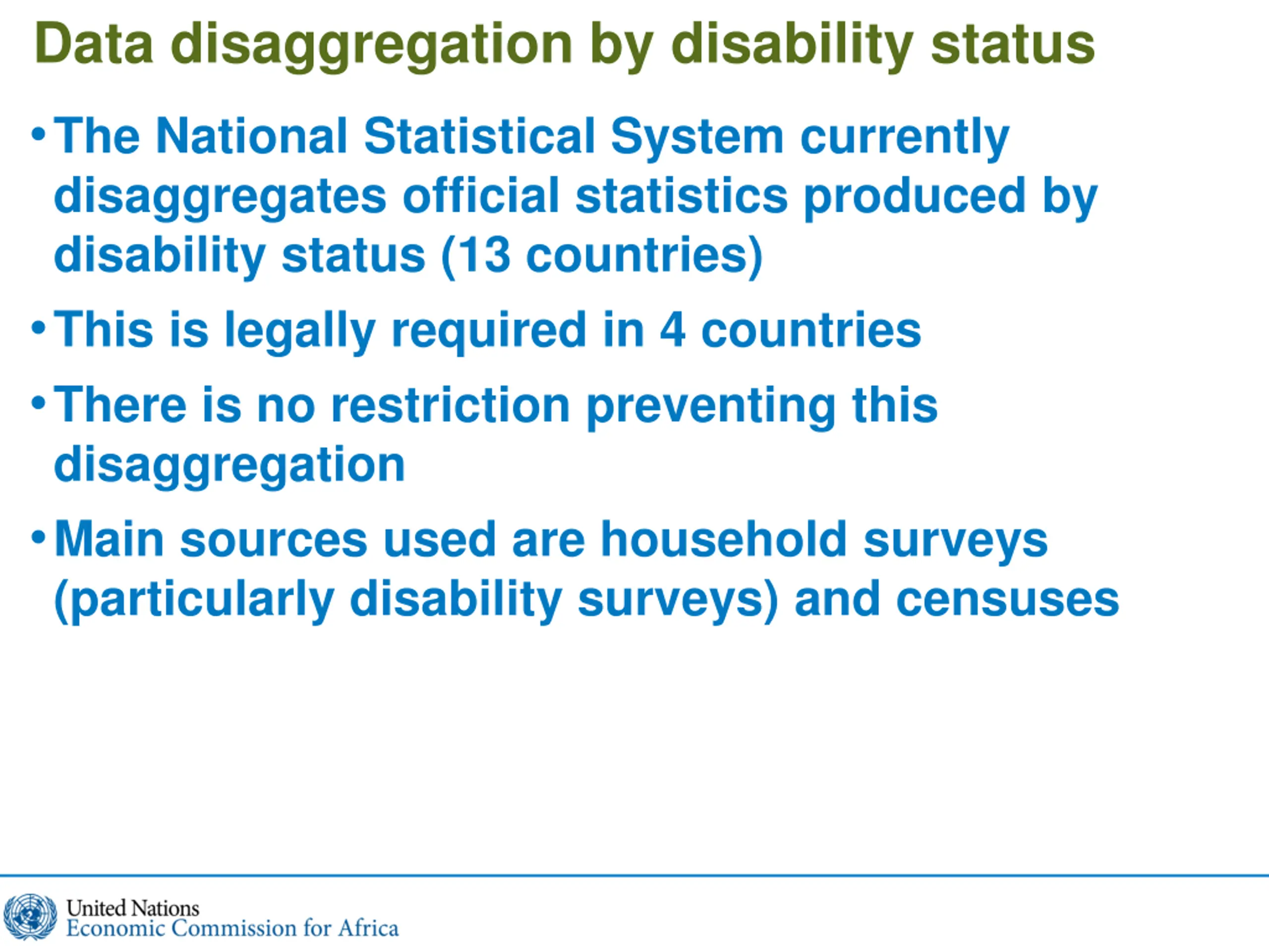 Data disaggregation by disability status The National Statistical System currently disaggregates official statistics produced by disability status (13 countries) This is legally required in 4 countries There is no restriction preventing this disaggregation Main sources used are household surveys (particularly disability surveys) and censuses