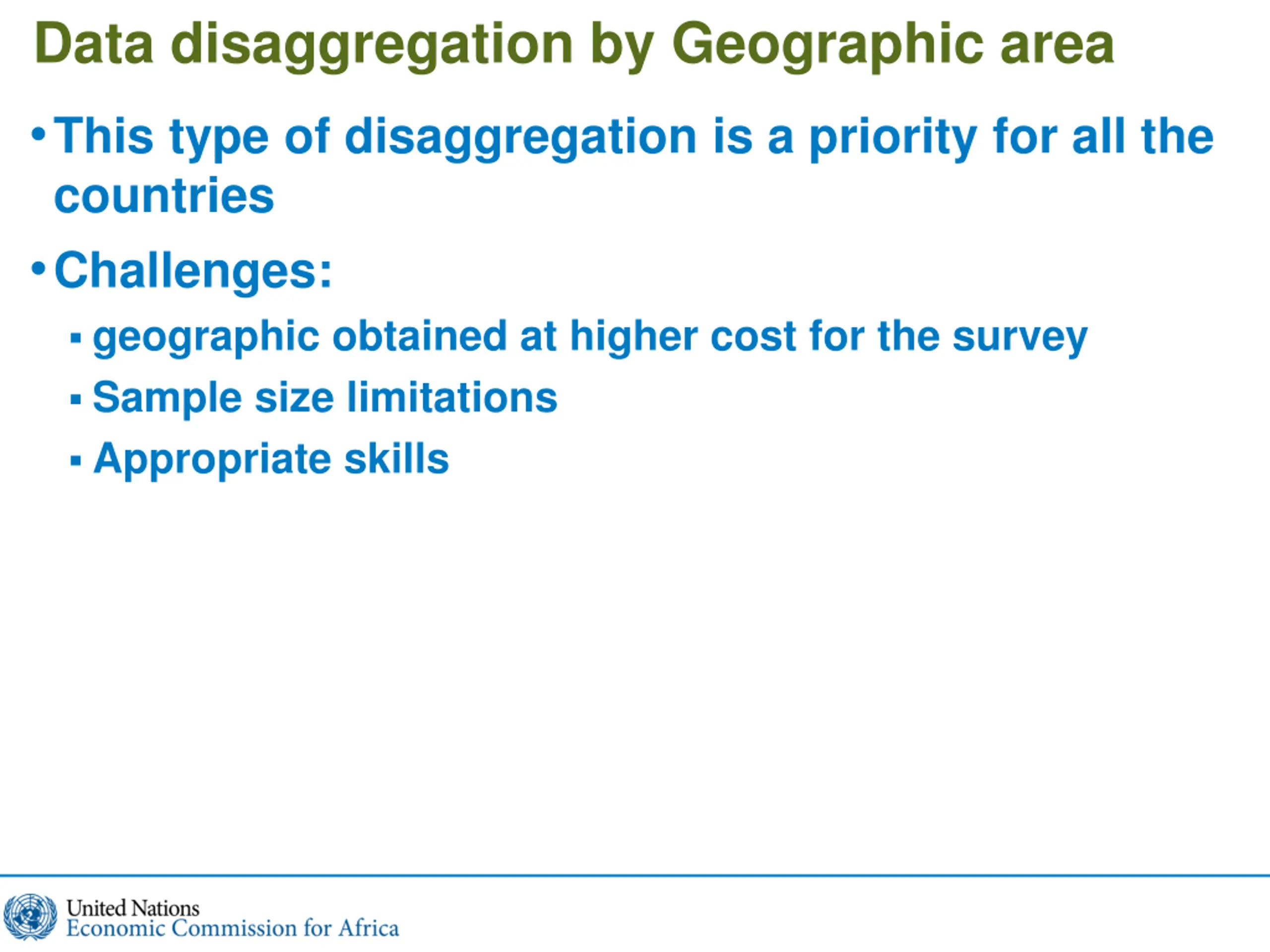Data disaggregation by Geographic area This type of disaggregation is a priority for all the countries Challenges: geographic obtained at higher cost for the survey Sample size limitations Appropriate skills