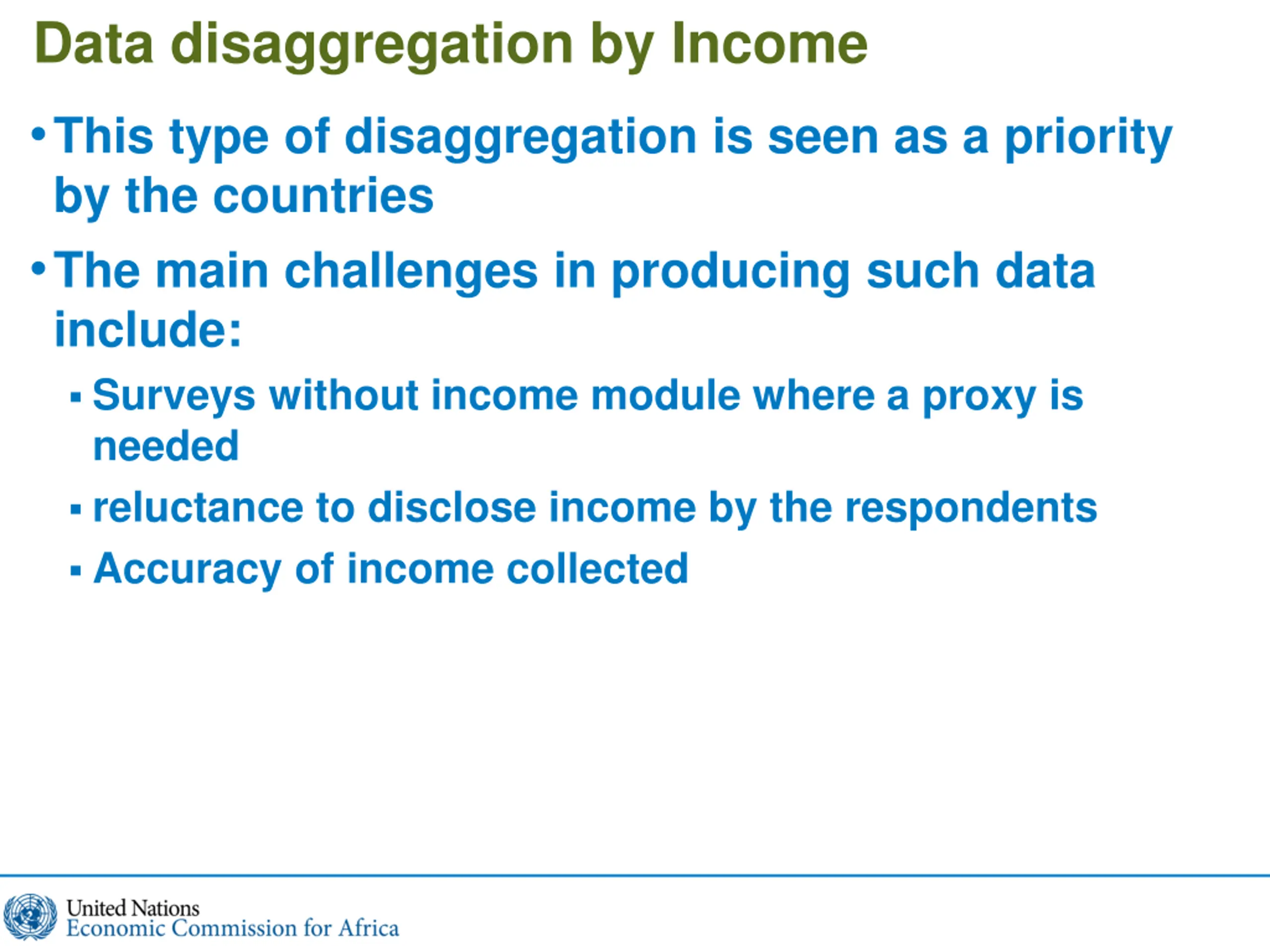 Data disaggregation by Income This type of disaggregation is seen as a priority by the countries The main challenges in producing such data include: Surveys without income module where a proxy is needed reluctance to disclose income by the respondents Accuracy of income collected