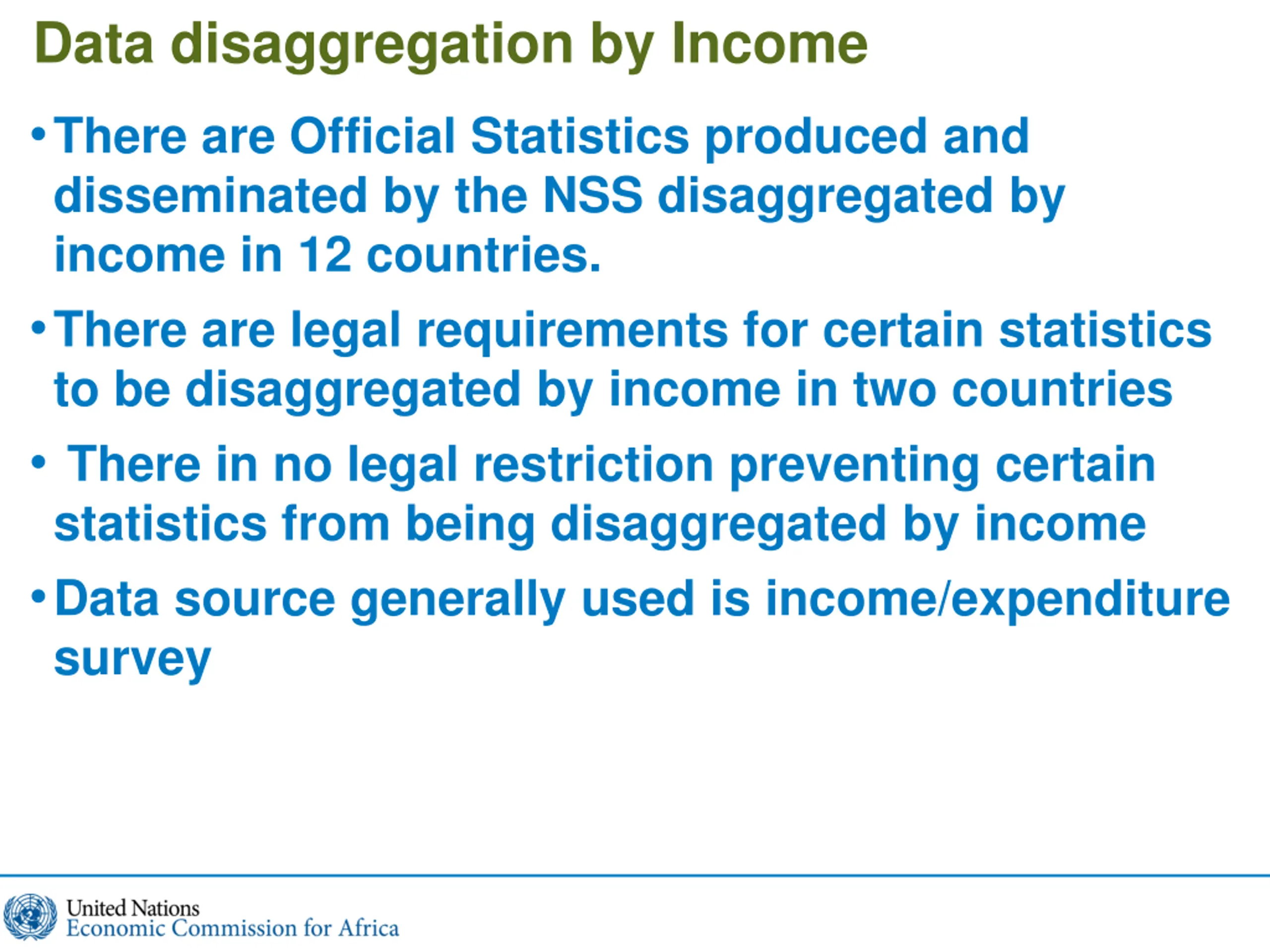 Data disaggregation by Income There are Official Statistics produced and disseminated by the NSS disaggregated by income in 12 countries. There are legal requirements for certain statistics to be disaggregated by income in two countries There in no legal restriction preventing certain statistics from being disaggregated by income Data source generally used is income/expenditure survey