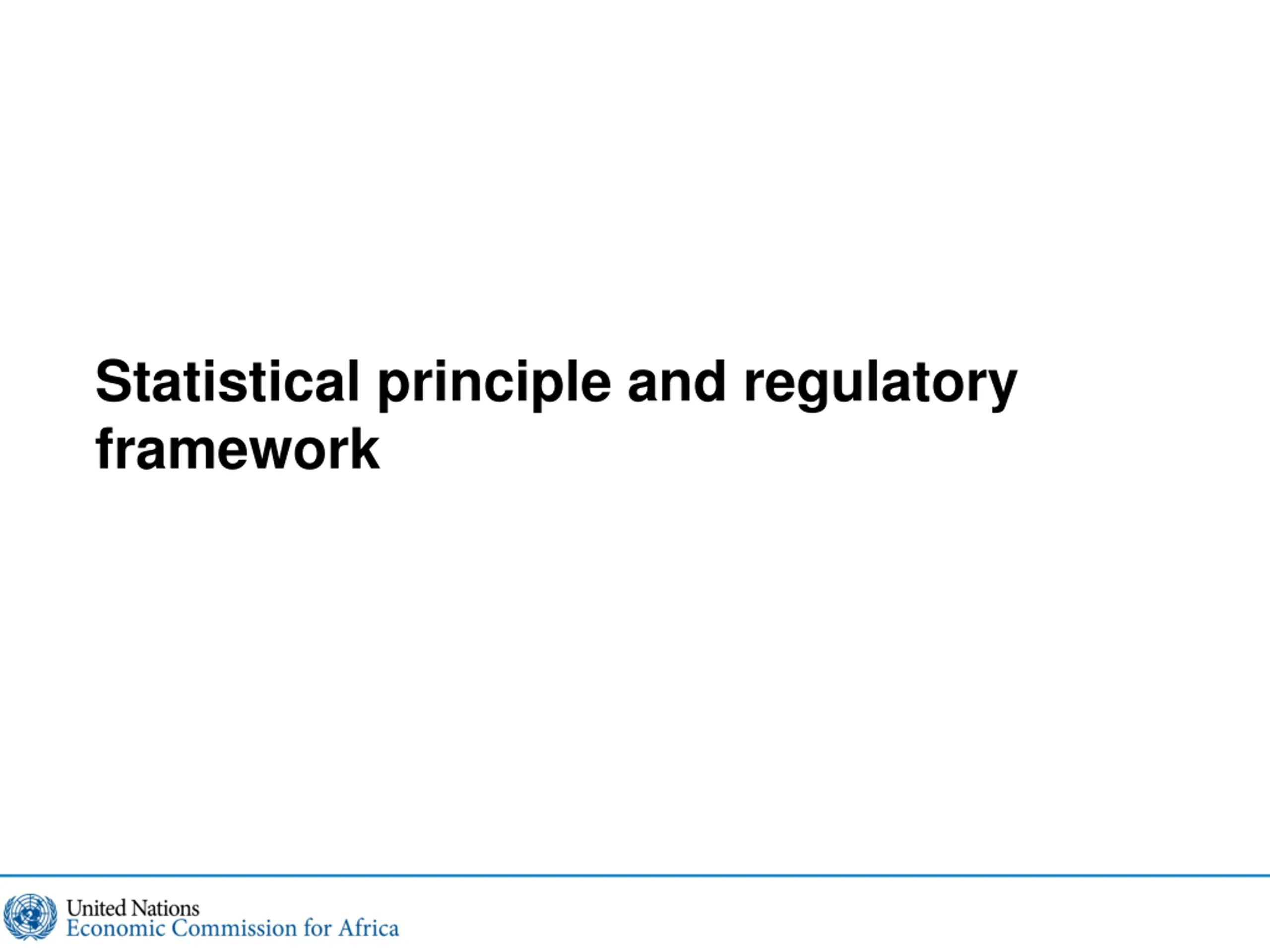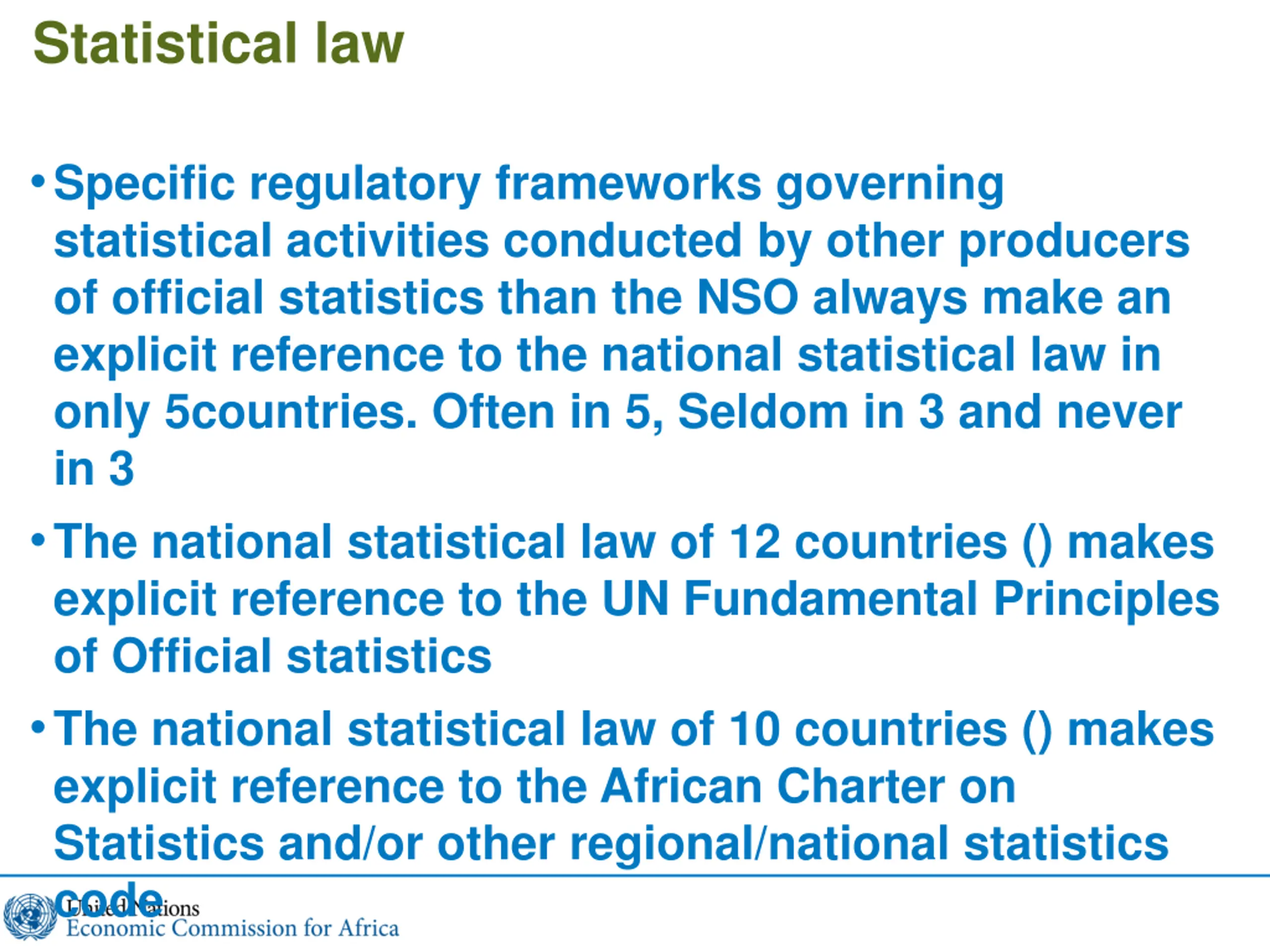 Statistical law Specific regulatory frameworks governing statistical activities conducted by other producers of official statistics than the NSO always make an explicit reference to the national statistical law in only 5countries. Often in 5, Seldom in 3 and never in 3 The national statistical law of 12 countries () makes explicit reference to the UN Fundamental Principles of Official statistics The national statistical law of 10 countries () makes explicit reference to the African Charter on Statistics and/or other regional/national statistics code