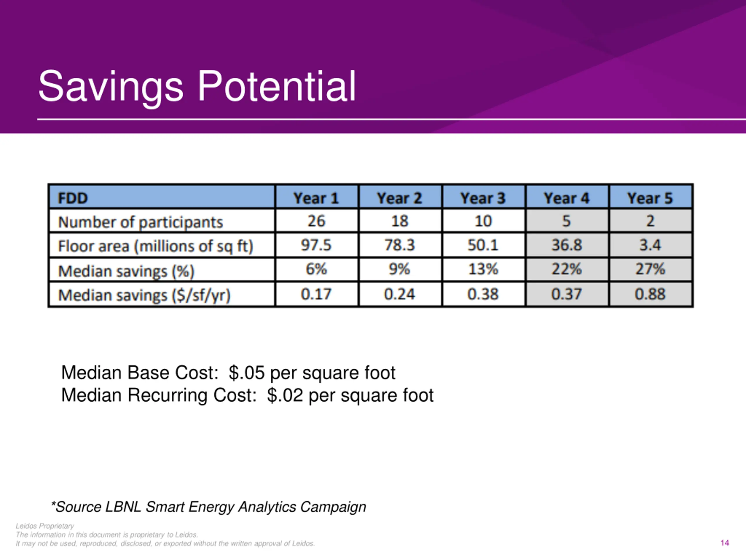 Savings Potential Median Base Cost: $.05 per square foot Median Recurring Cost: $.02 per square foot *Source LBNL Smart Energy Analytics Campaign Leidos Proprietary The information in this document is proprietary to Leidos. It may not be used, reproduced, disclosed, or exported without the written approval of Leidos. 14