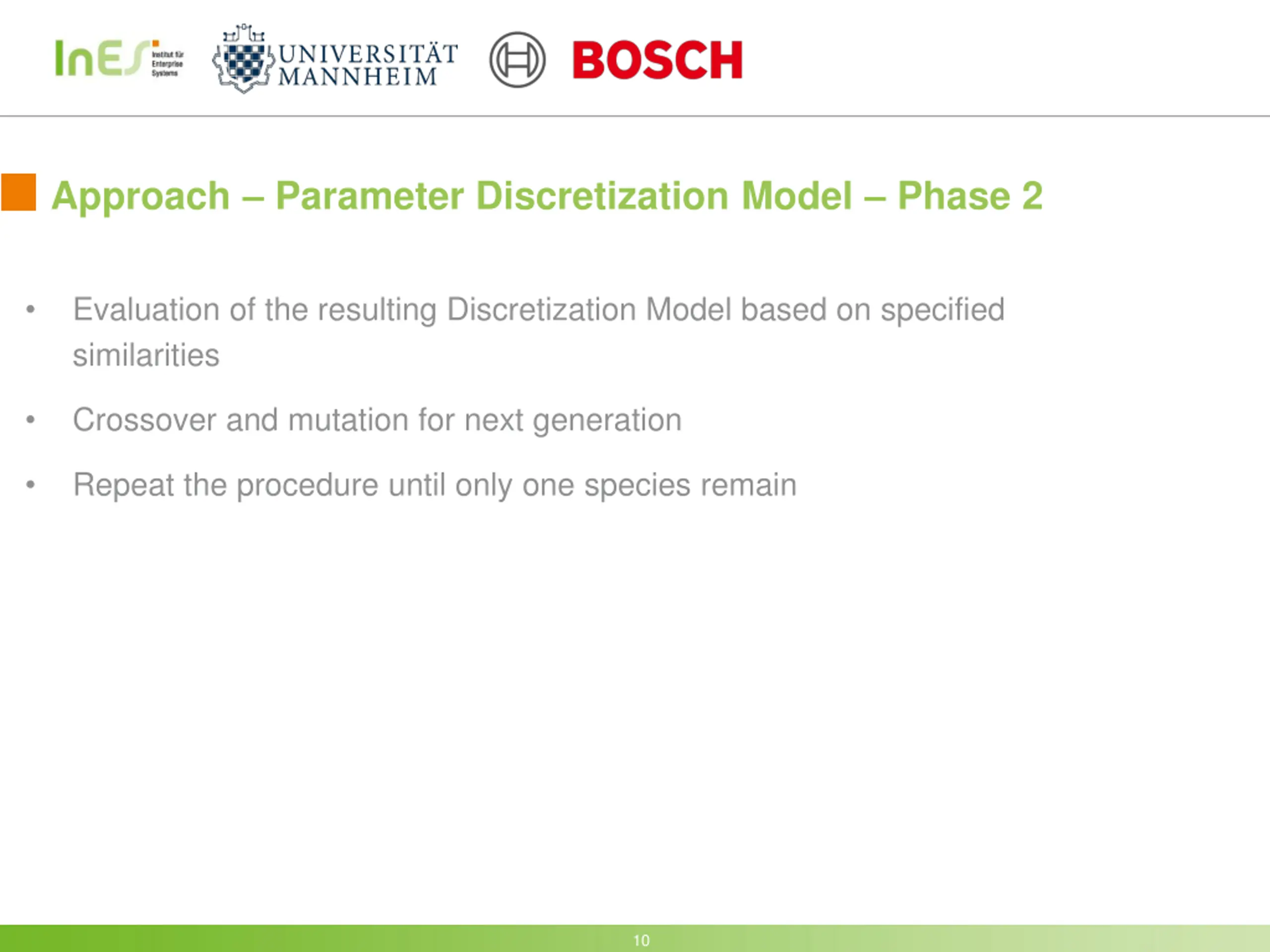 Approach Parameter Discretization Model Phase 2 Evaluation of the resulting Discretization Model based on specified similarities Crossover and mutation for next generation Repeat the procedure until only one species remain 10