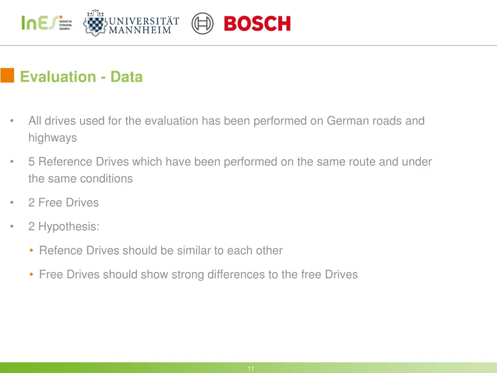 Evaluation - Data All drives used for the evaluation has been performed on German roads and highways 5 Reference Drives which have been performed on the same route and under the same conditions 2 Free Drives 2 Hypothesis: Refence Drives should be similar to each other Free Drives should show strong differences to the free Drives 11