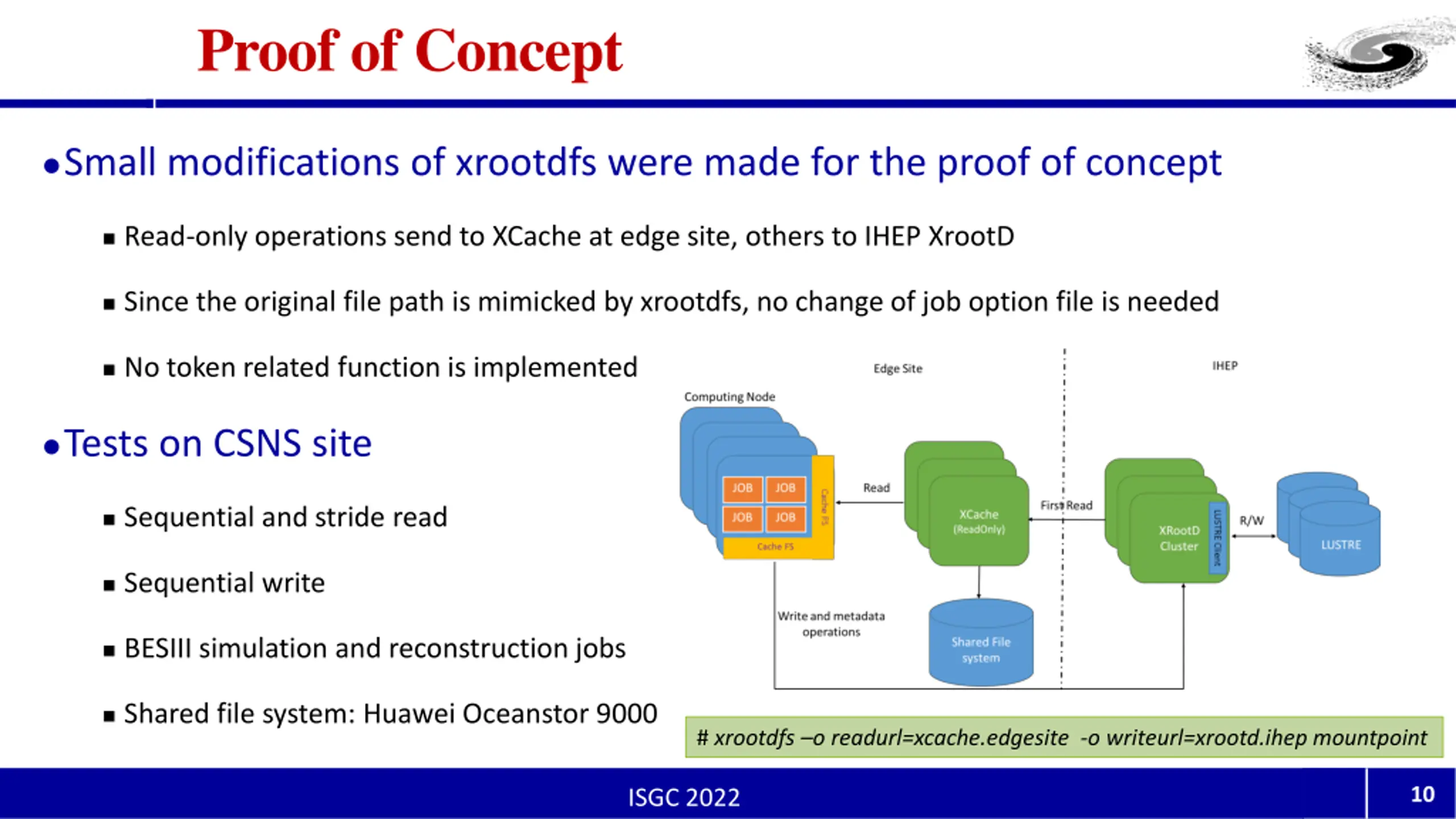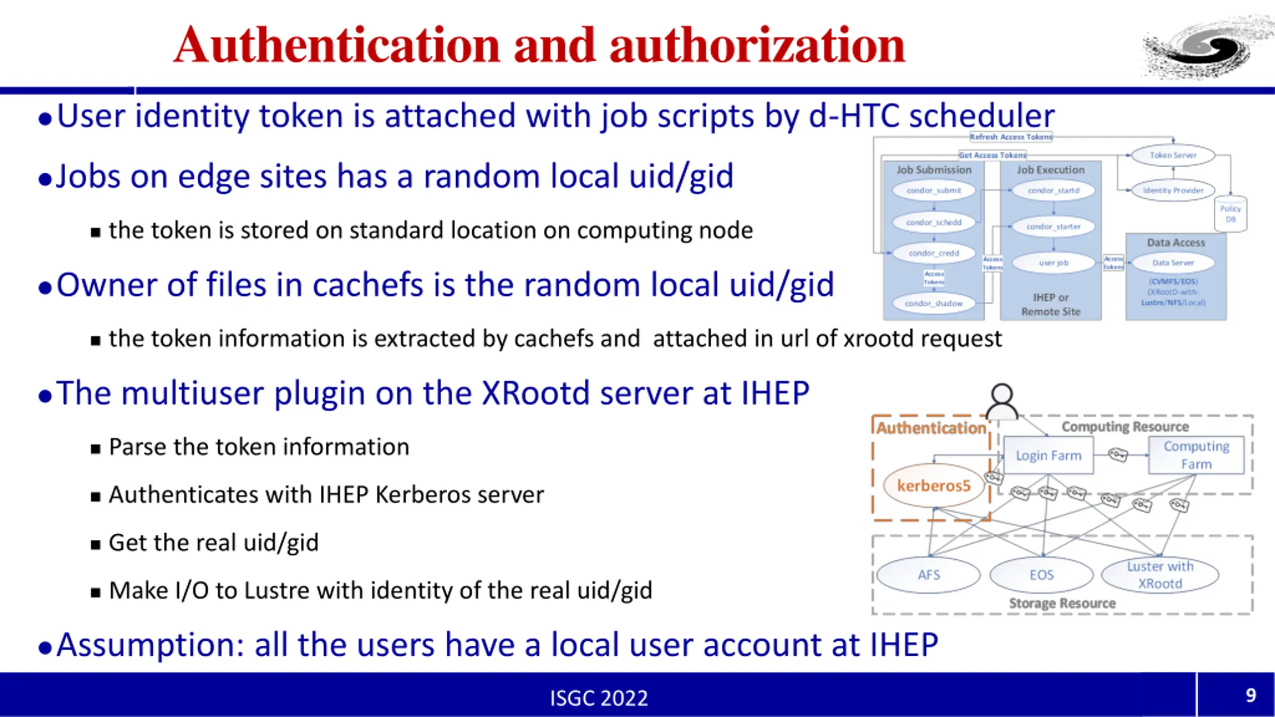 Authentication and authorization User identity token is attached with job scripts by d-HTC scheduler Jobs on edge sites has a random local uid/gid the token is stored on standard location on computing node Owner of files in cachefs is the random local uid/gid the token information is extracted by cachefs and attached in url of xrootd request The multiuser plugin on the XRootd server at IHEP Parse the token information Authenticates with IHEP Kerberos server Get the real uid/gid Make I/O to Lustre with identity of the real uid/gid Assumption: all the users have a local user account at IHEP 9 ISGC 2022