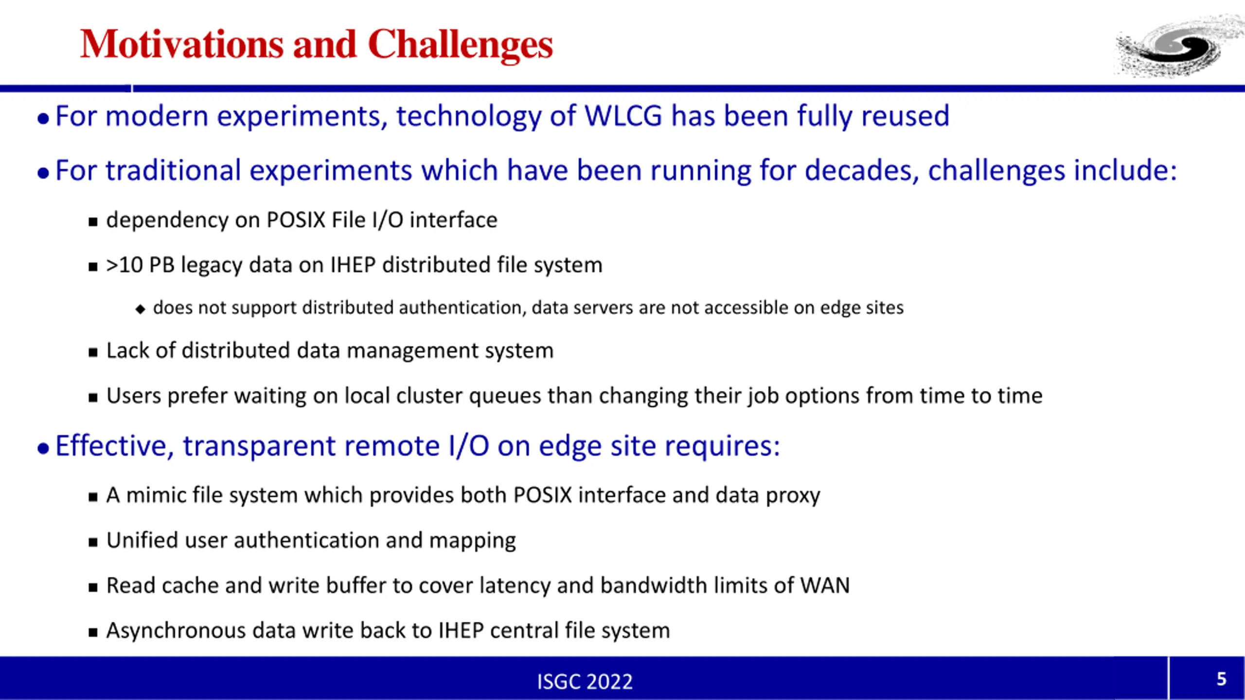 One Platform, Multi-Centers (2/2) Since 2020, resource of edge sites have developed to a significant scale CPU cores at edge site has summed up to a larger number than IHEP Storages on edge sites are limited For most experiment has only one complete data replica at IHEP Effective, transparent data I/O from edge sites to IHEP is crucial for the overall efficiency 4 ISGC 2022
