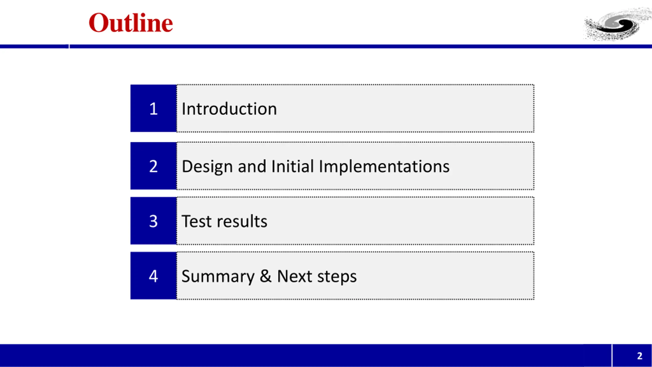 Outline 1 Introduction 2 Design and Initial Implementations 3 Test results 4 Summary & Next steps 2