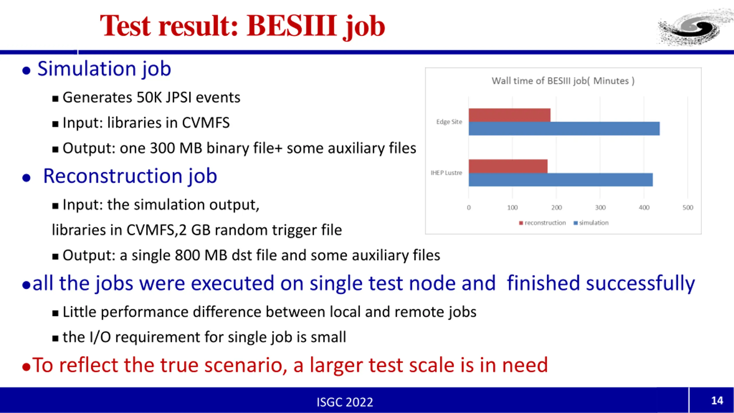 Test result: BESIII job Simulation job Generates 50K JPSI events Input: libraries in CVMFS Output: one 300 MB binary file+ some auxiliary files Reconstruction job Input: the simulation output, libraries in CVMFS,2 GB random trigger file Output: a single 800 MB dst file and some auxiliary files all the jobs were executed on single test node and finished successfully Little performance difference between local and remote jobs the I/O requirement for single job is small To reflect the true scenario, a larger test scale is in need 14 ISGC 2022