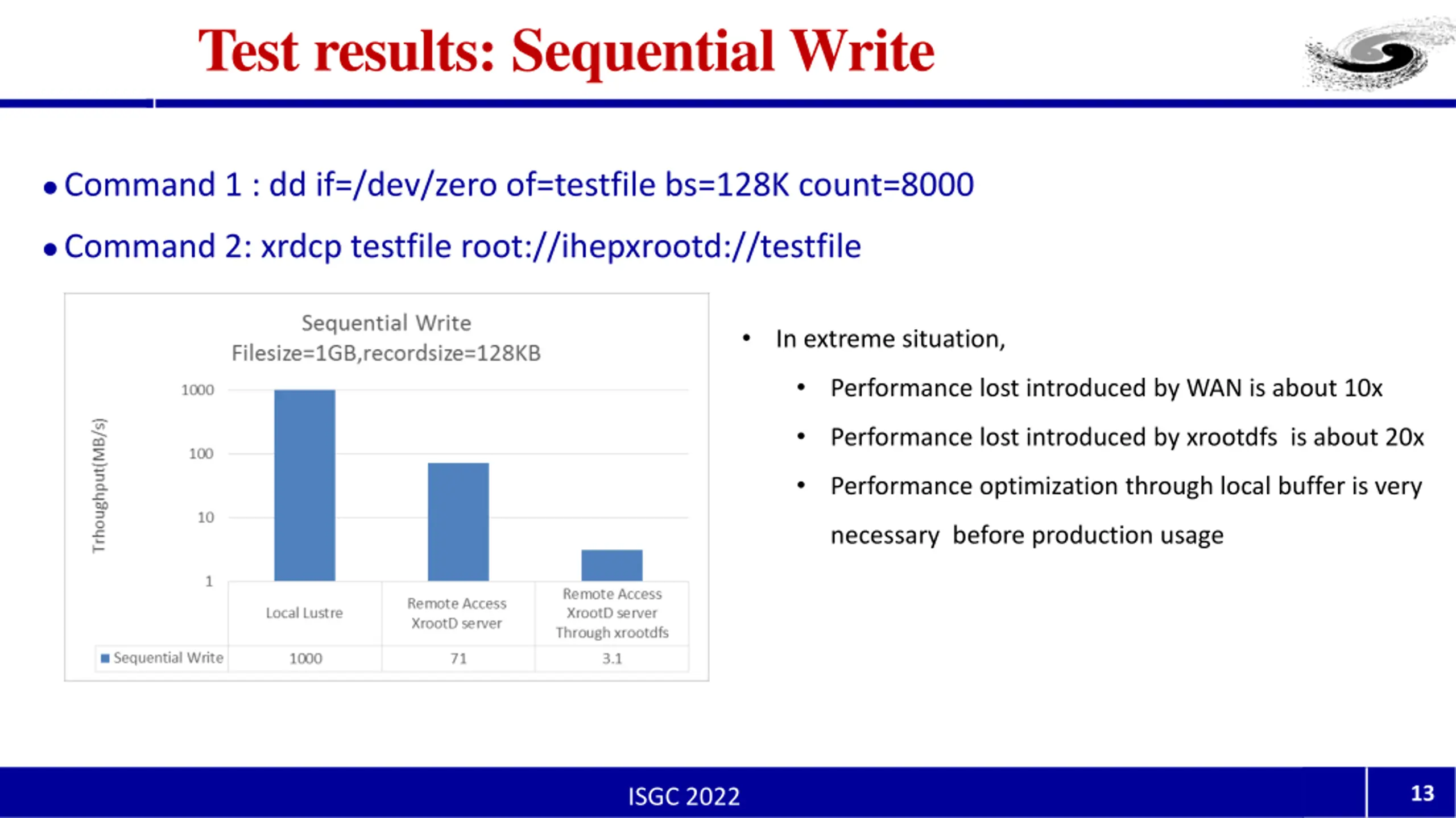 Test results: Sequential Write Command 1 : dd if=/dev/zero of=testfile bs=128K count=8000 Command 2: xrdcp testfile root://ihepxrootd://testfile In extreme situation, Performance lost introduced by WAN is about 10x Performance lost introduced by xrootdfs is about 20x Performance optimization through local buffer is very necessary before production usage 13 ISGC 2022