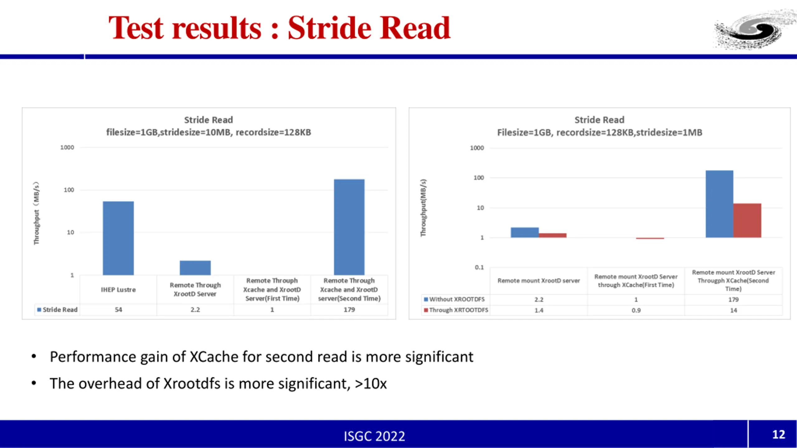 Test results : Sequential Read With Xcache, second time sequential read throughput can catch up with IHEP Lustre Xrootdfs introduces a significant performance overhead ~2x 11 ISGC 2022
