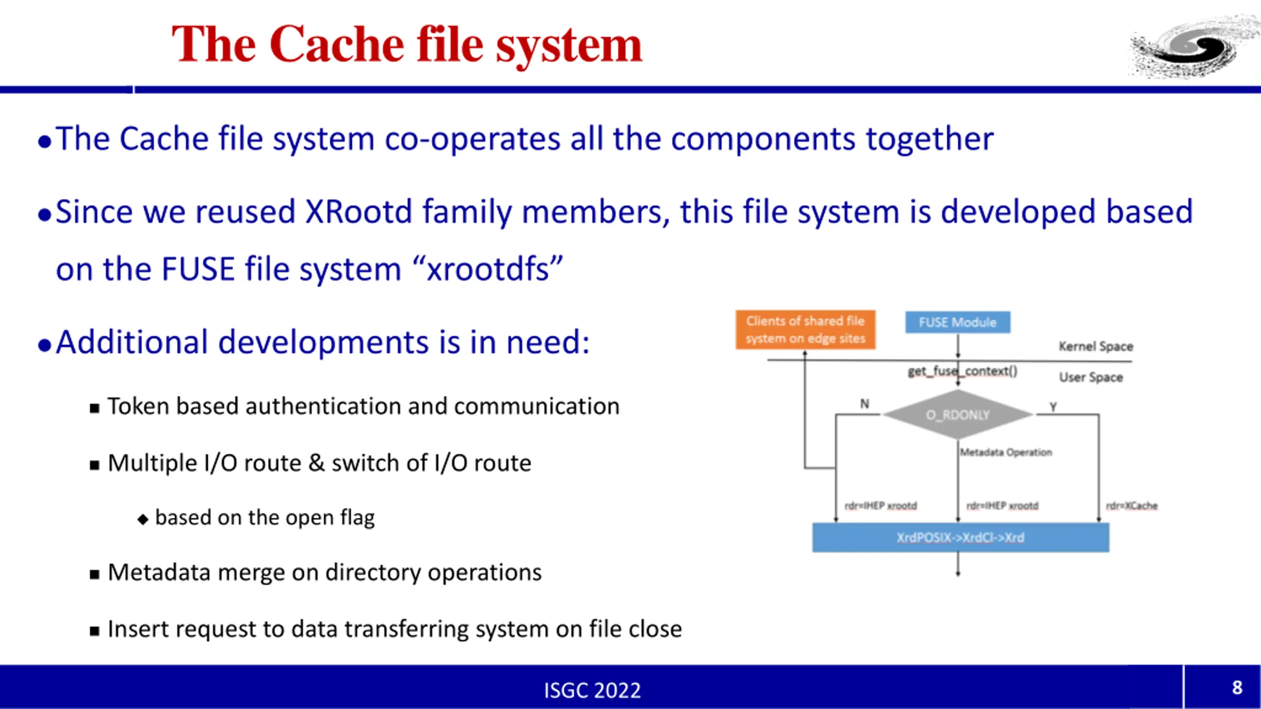 Overall Architecture XRootD cluster at IHEP Exports IHEP Lustre file system to the remote sites, authentication and permission check XCache cluster on edge site Accelerates read-only data access Cache file system Write data to local distributed file system Read data from XCache cluster Shared file system on remote site Provides shared disk storage for XCache & the Cache file systems on computing node Site-Wide data consistency Authentication Domain of One platform, multi Centers Data transferring system Upload new files asynchronously to IHEP XRootD cluster 7 ISGC 2022