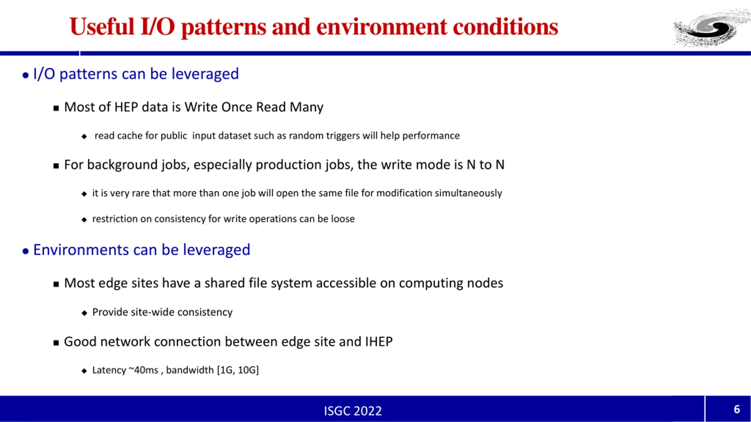 Useful I/O patterns and environment conditions I/O patterns can be leveraged Most of HEP data is Write Once Read Many read cache for public input dataset such as random triggers will help performance For background jobs, especially production jobs, the write mode is N to N it is very rare that more than one job will open the same file for modification simultaneously restriction on consistency for write operations can be loose Environments can be leveraged Most edge sites have a shared file system accessible on computing nodes Provide site-wide consistency Good network connection between edge site and IHEP Latency ~40ms , bandwidth [1G, 10G] 6 ISGC 2022