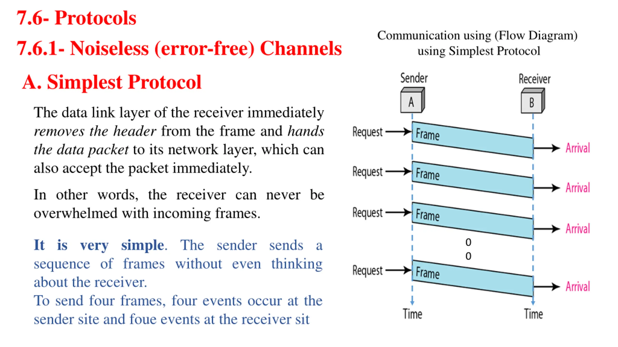 7.6- Protocols 7.6.1- Noiseless (error-free) Channels A. Simplest Protocol Communication using (Flow Diagram) using Simplest Protocol The data link layer of the receiver immediately removes the header from the frame and hands the data packet to its network layer, which can also accept the packet immediately. In other words, the receiver can never be overwhelmed with incoming frames. It is very simple. The sender sends a sequence of frames without even thinking about the receiver. To send four frames, four events occur at the sender site and foue events at the receiver sit 0 0