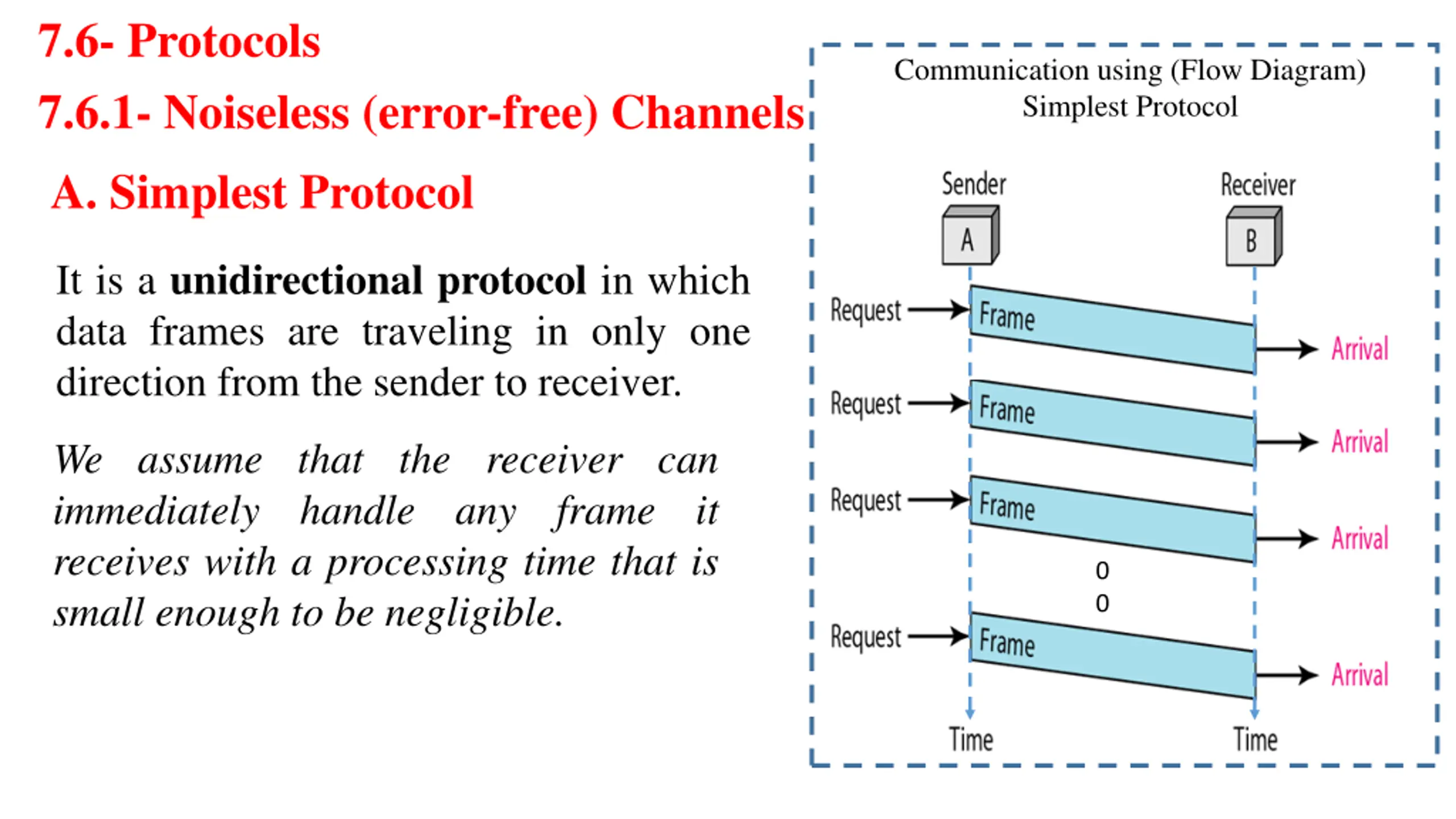 7.6- Protocols 7.6.1- Noiseless (error-free) Channels A. Simplest Protocol Communication using (Flow Diagram) Simplest Protocol It is a unidirectional protocol in which data frames are traveling in only one direction from the sender to receiver. We assume that the receiver can immediately handle any frame it receives with a processing time that is small enough to be negligible. 0 0