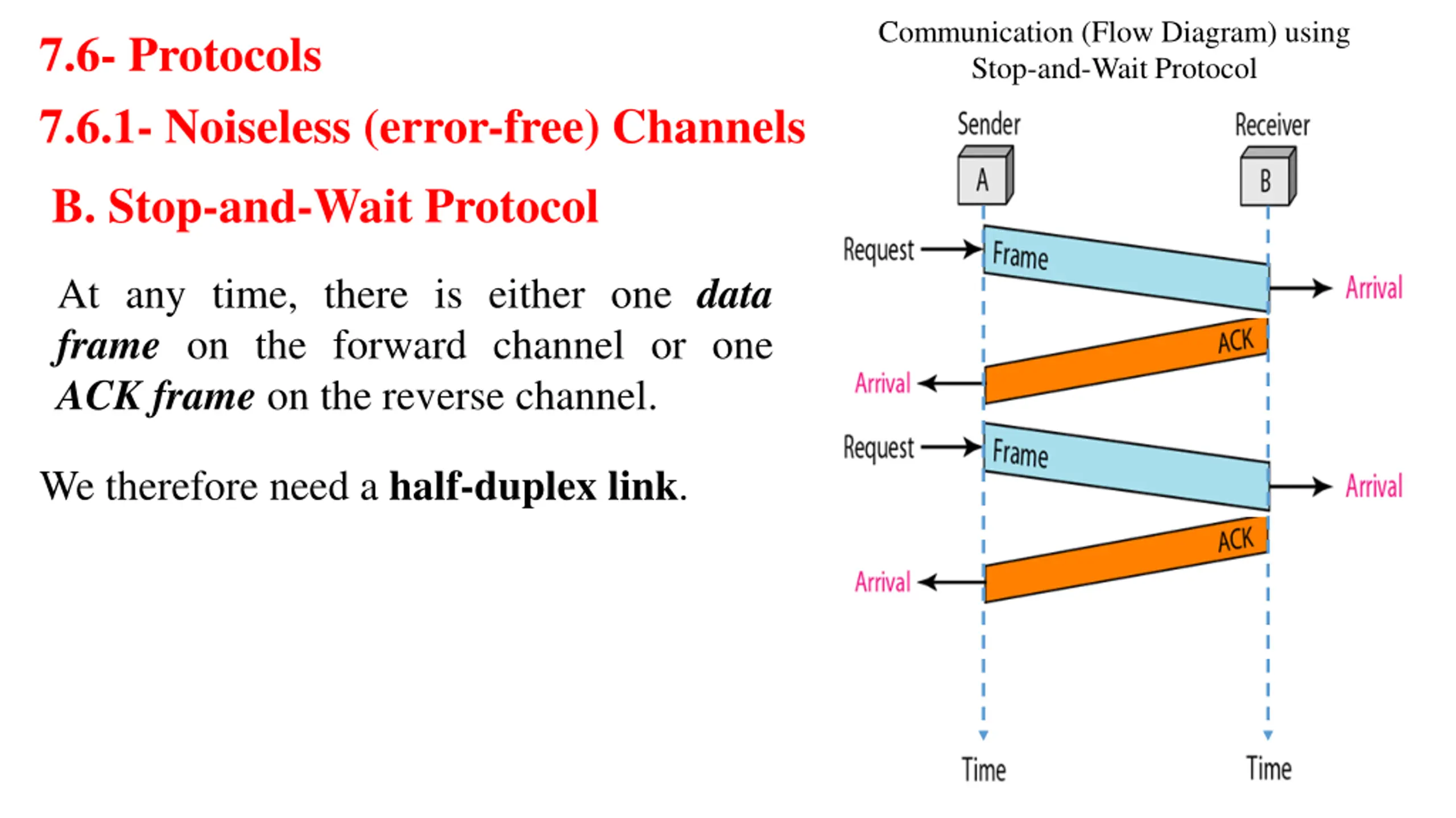 Communication (Flow Diagram) using Stop-and-Wait Protocol 7.6- Protocols 7.6.1- Noiseless (error-free) Channels B. Stop-and-Wait Protocol At any time, there is either one data frame on the forward channel or one ACK frame on the reverse channel. We therefore need a half-duplex link.