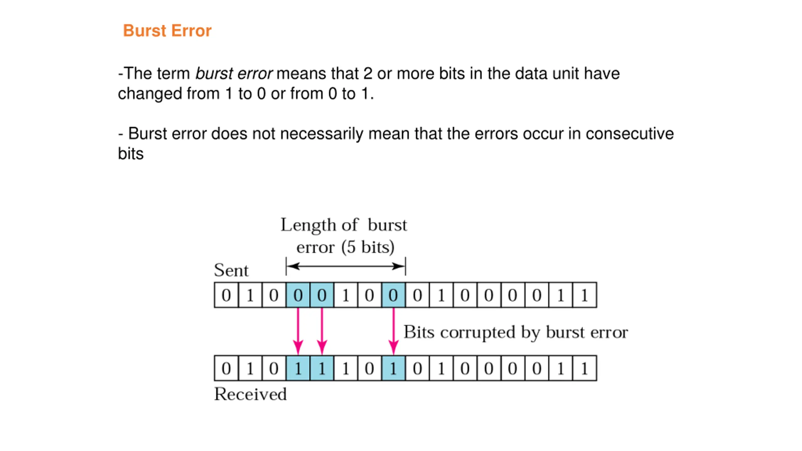 Burst Error -The term burst error means that 2 or more bits in the data unit have changed from 1 to 0 or from 0 to 1. - Burst error does not necessarily mean that the errors occur in consecutive bits