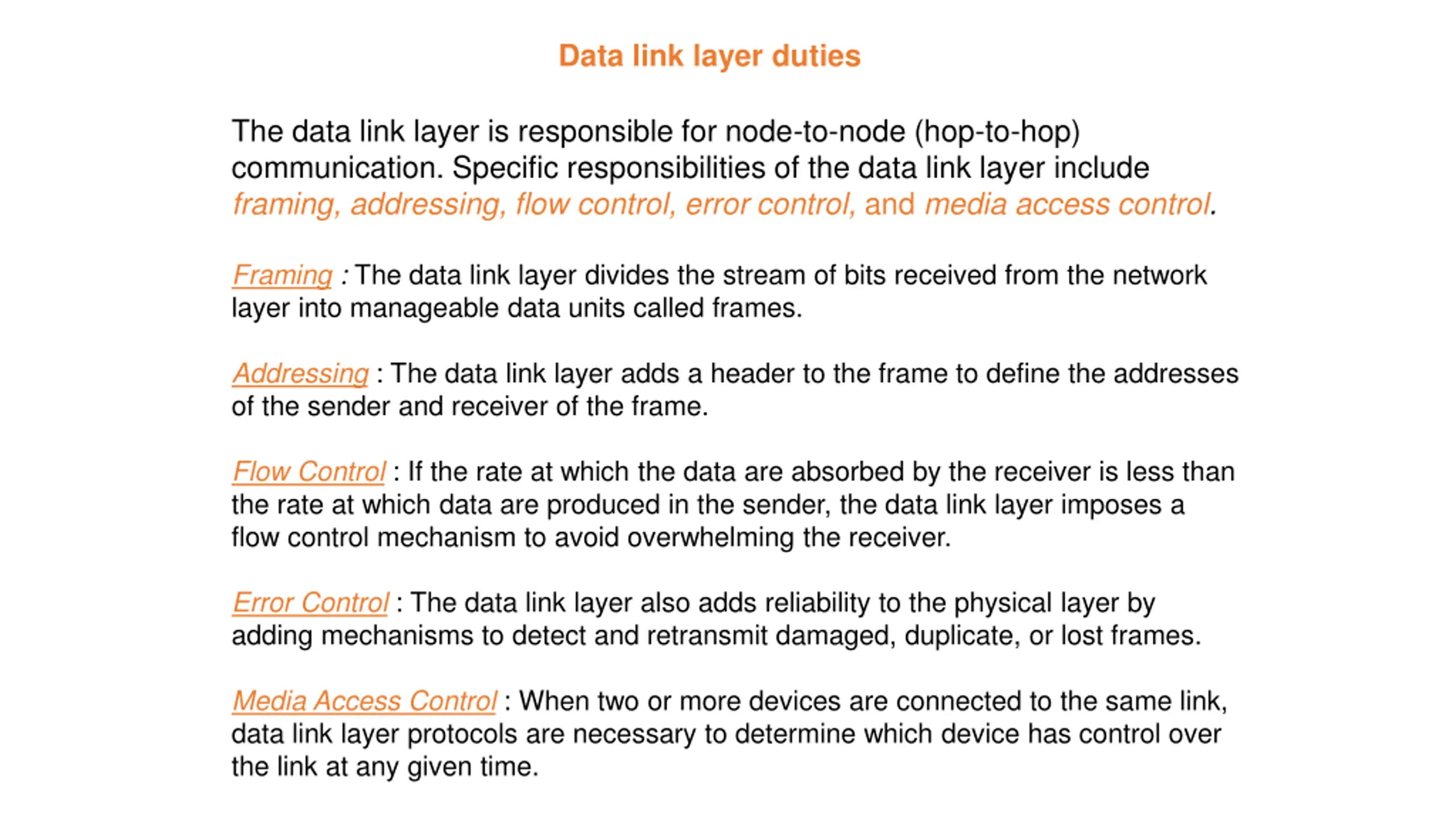 Data link layer duties The data link layer is responsible for node-to-node (hop-to-hop) communication. Specific responsibilities of the data link layer include framing, addressing, flow control, error control, and media access control. Framing : The data link layer divides the stream of bits received from the network layer into manageable data units called frames. Addressing : The data link layer adds a header to the frame to define the addresses of the sender and receiver of the frame. Flow Control : If the rate at which the data are absorbed by the receiver is less than the rate at which data are produced in the sender, the data link layer imposes a flow control mechanism to avoid overwhelming the receiver. Error Control : The data link layer also adds reliability to the physical layer by adding mechanisms to detect and retransmit damaged, duplicate, or lost frames. Media Access Control : When two or more devices are connected to the same link, data link layer protocols are necessary to determine which device has control over the link at any given time.