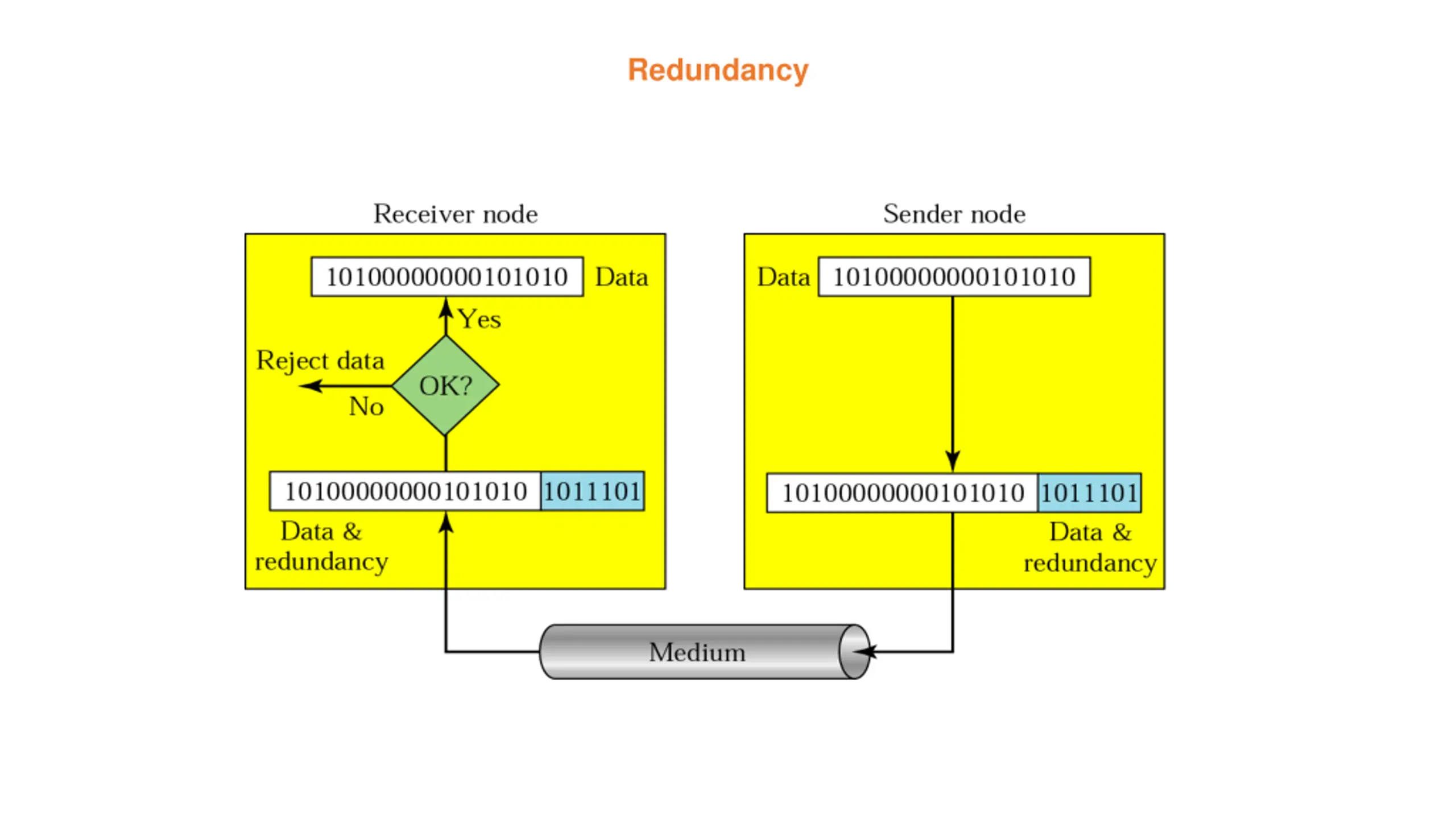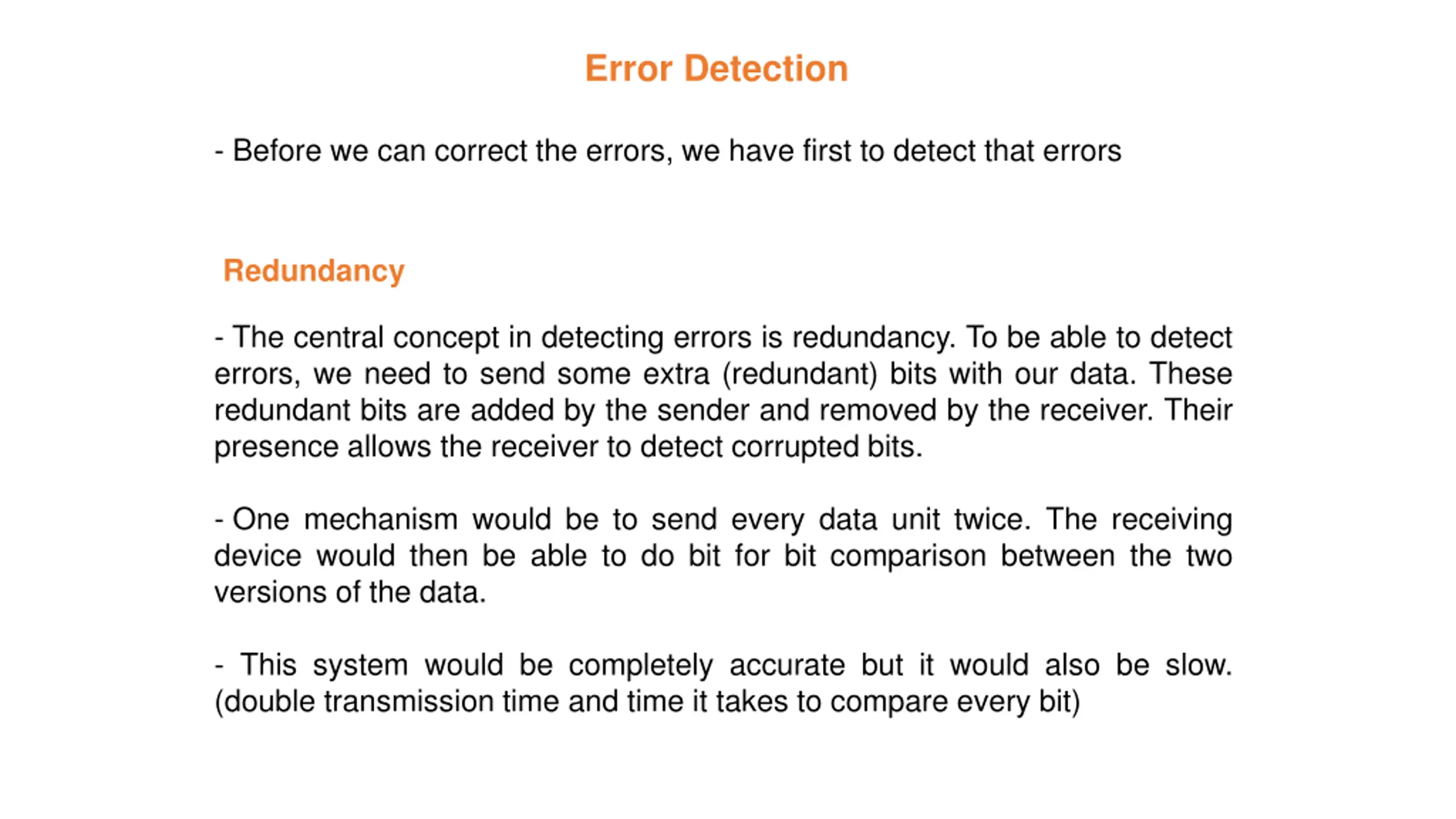 Error Detection - Before we can correct the errors, we have first to detect that errors Redundancy - The central concept in detecting errors is redundancy. To be able to detect errors, we need to send some extra (redundant) bits with our data. These redundant bits are added by the sender and removed by the receiver. Their presence allows the receiver to detect corrupted bits. - One mechanism would be to send every data unit twice. The receiving device would then be able to do bit for bit comparison between the two versions of the data. - This system would be completely accurate but it would also be slow. (double transmission time and time it takes to compare every bit)