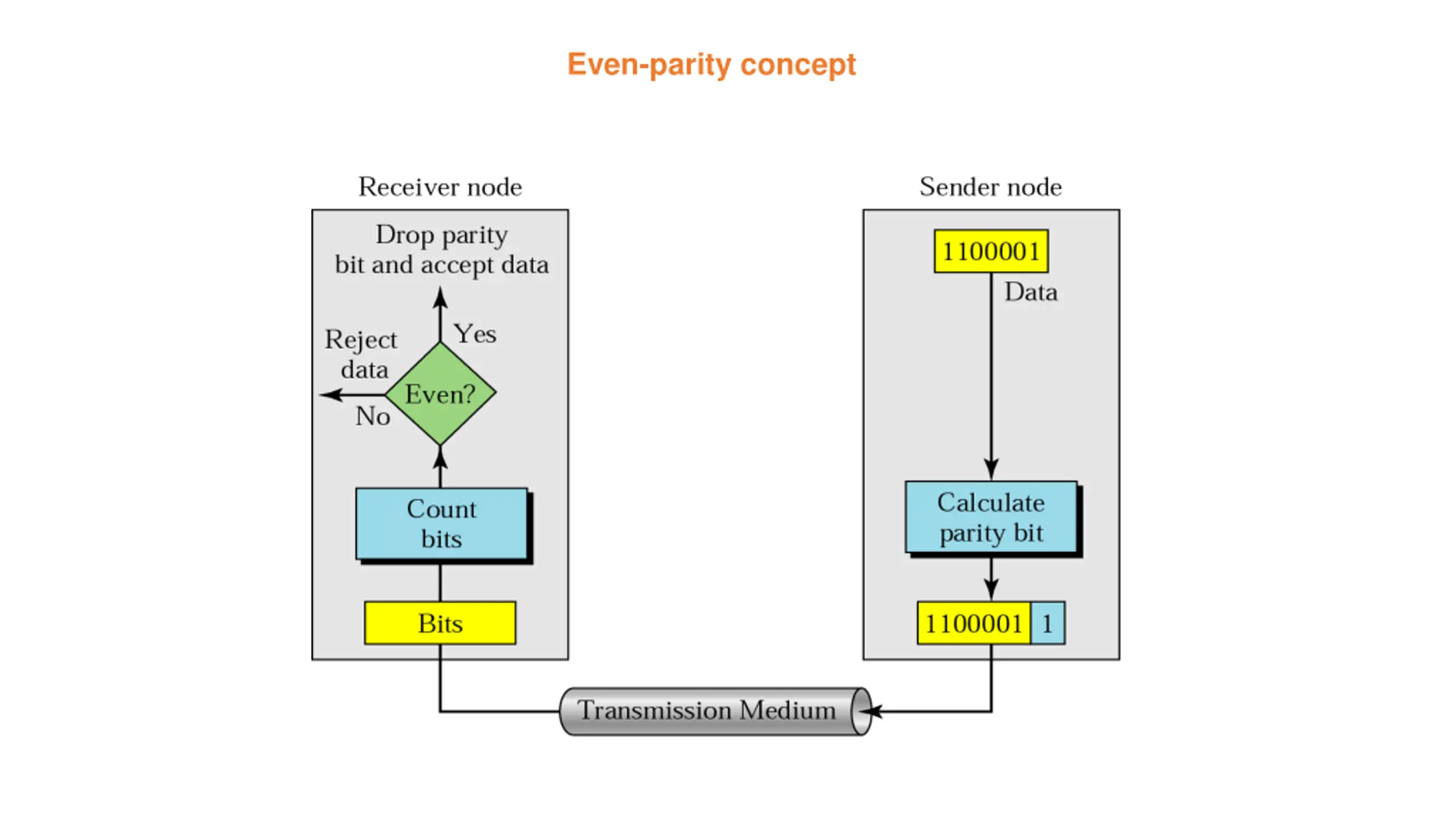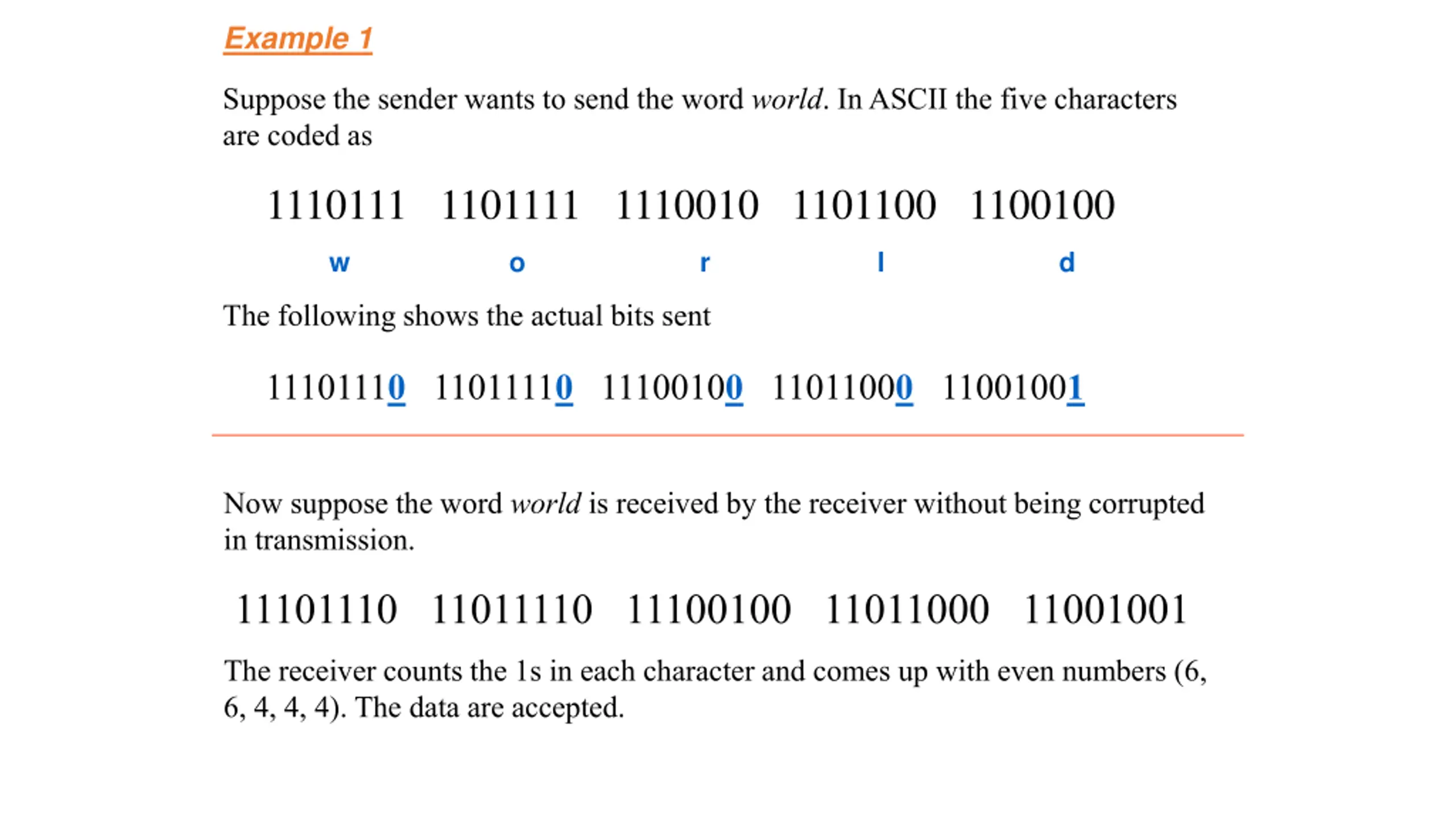 Example 1 Suppose the sender wants to send the word world. In ASCII the five characters are coded as 1110111 1101111 1110010 1101100 1100100 w o r l d The following shows the actual bits sent 11101110 11011110 11100100 11011000 11001001 Now suppose the word world is received by the receiver without being corrupted in transmission. 11101110 11011110 11100100 11011000 11001001 The receiver counts the 1s in each character and comes up with even numbers (6, 6, 4, 4, 4). The data are accepted.