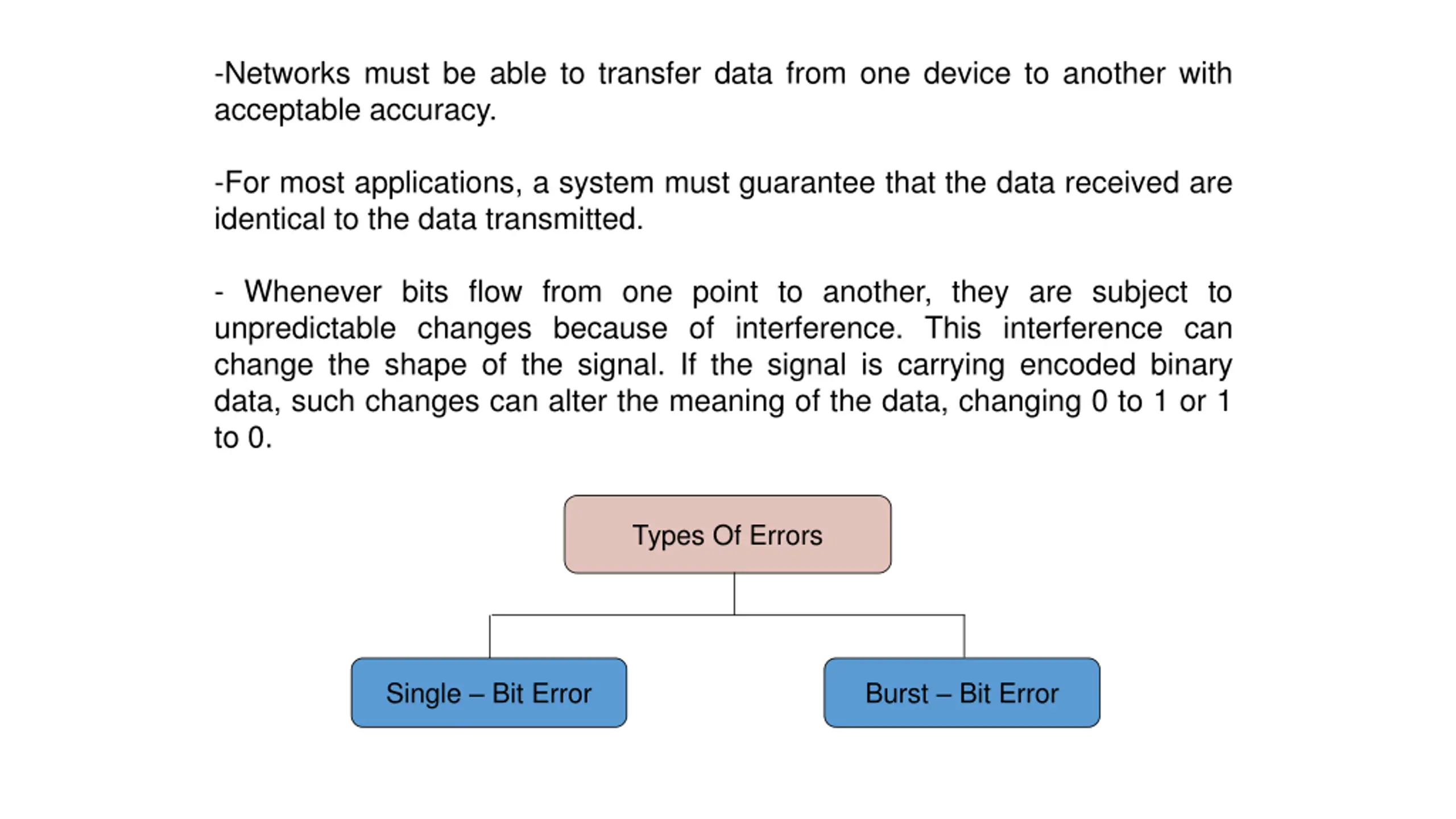 -Networks must be able to transfer data from one device to another with acceptable accuracy. -For most applications, a system must guarantee that the data received are identical to the data transmitted. - Whenever bits flow from one point to another, they are subject to unpredictable changes because of interference. This interference can change the shape of the signal. If the signal is carrying encoded binary data, such changes can alter the meaning of the data, changing 0 to 1 or 1 to 0. Types Of Errors Single Bit Error Burst Bit Error