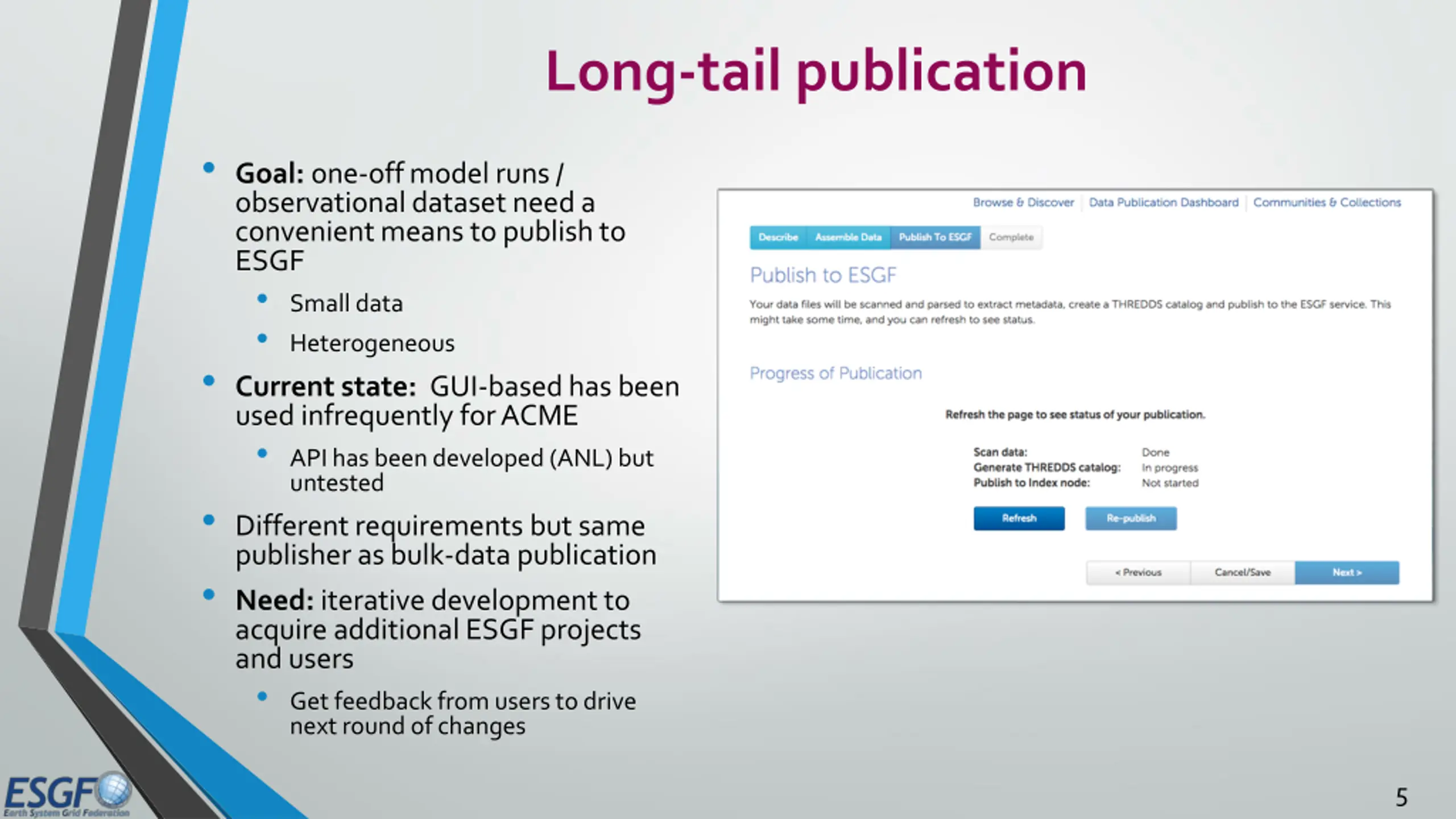 Long-tail publication Goal: one-off model runs / observational dataset need a convenient means to publish to ESGF Small data Heterogeneous Current state: GUI-based has been used infrequently for ACME API has been developed (ANL) but untested Different requirements but same publisher as bulk-data publication Need: iterative development to acquire additional ESGF projects and users Get feedback from users to drive next round of changes 5