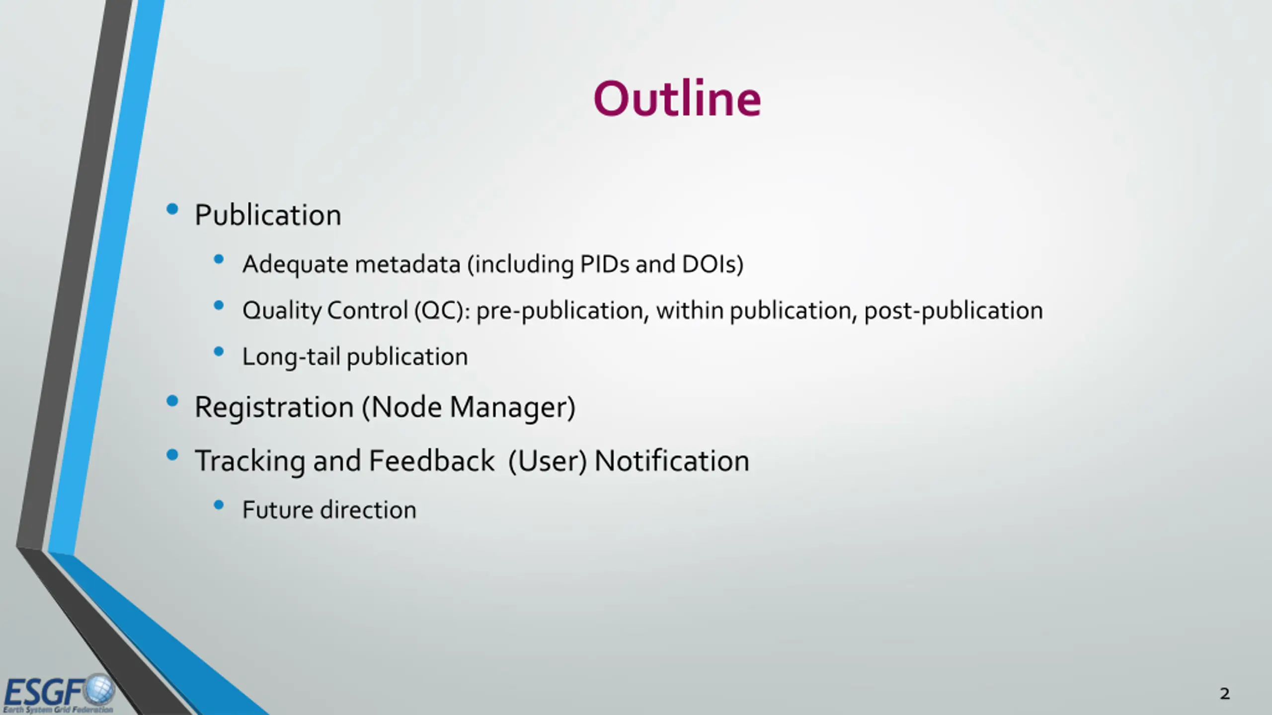 Outline Publication Adequate metadata (including PIDs and DOIs) Quality Control (QC): pre-publication, within publication, post-publication Long-tail publication Registration (Node Manager) Tracking and Feedback (User) Notification Future direction 2