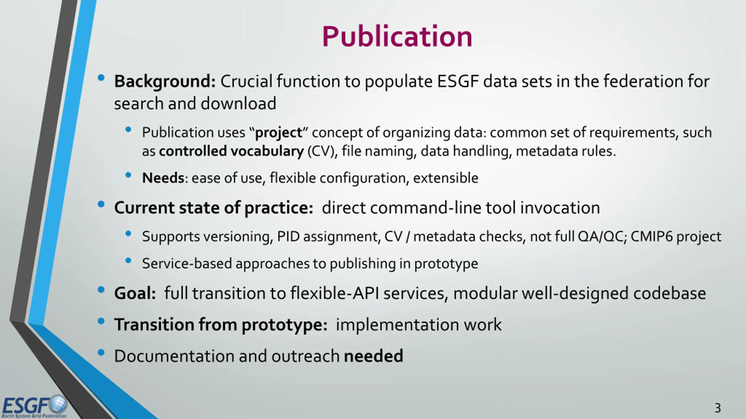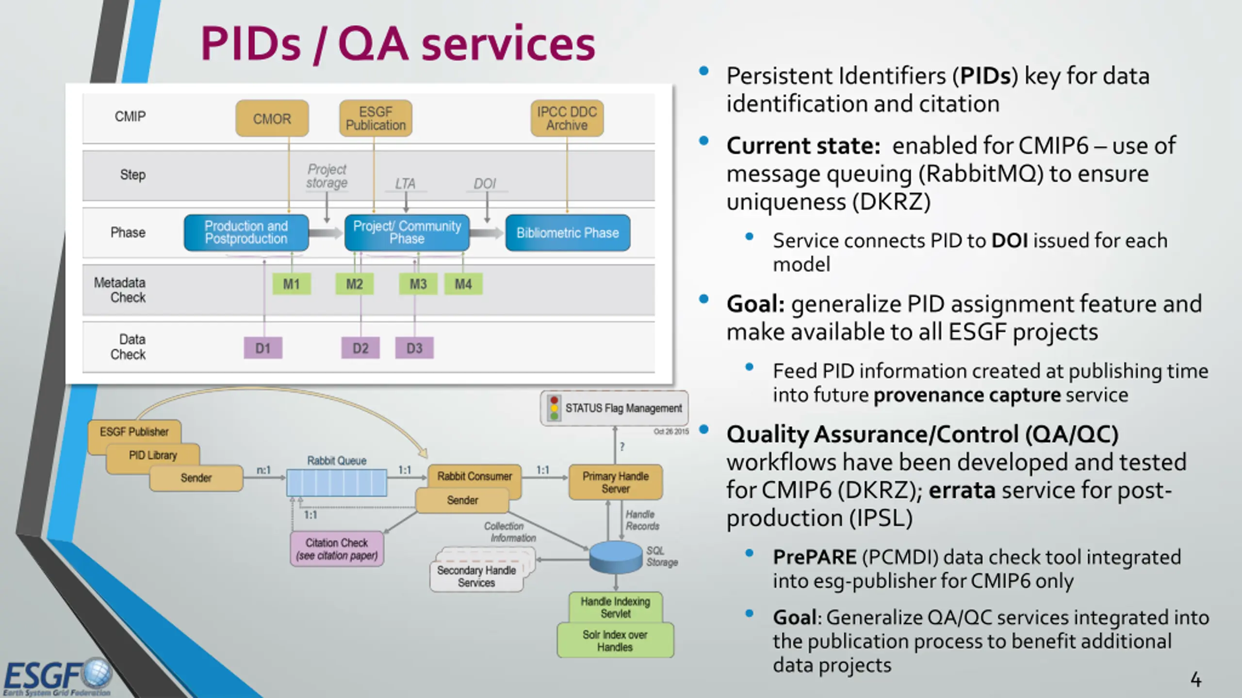 Publication Background: Crucial function to populate ESGF data sets in the federation for search and download Publication uses project concept of organizing data: common set of requirements, such as controlled vocabulary (CV), file naming, data handling, metadata rules. Needs: ease of use, flexible configuration, extensible Current state of practice: direct command-line tool invocation Supports versioning, PID assignment, CV / metadata checks, not full QA/QC; CMIP6 project Service-based approaches to publishing in prototype Goal: full transition to flexible-API services, modular well-designed codebase Transition from prototype: implementation work Documentation and outreach needed 3