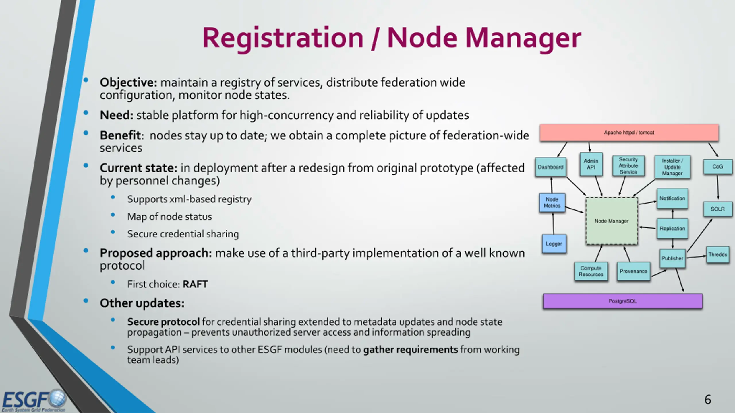 Registration / Node Manager Objective: maintain a registry of services, distribute federation wide configuration, monitor node states. Need: stable platform for high-concurrency and reliability of updates Benefit: nodes stay up to date; we obtain a complete picture of federation-wide services Current state: in deployment after a redesign from original prototype (affected by personnel changes) Supports xml-based registry Map of node status Secure credential sharing Proposed approach: make use of a third-party implementation of a well known protocol First choice: RAFT Other updates: Secure protocol for credential sharing extended to metadata updates and node state propagation prevents unauthorized server access and information spreading Support API services to other ESGF modules (need to gatherrequirements from working team leads) Apache httpd / tomcat Security Attribute Service Installer / Update Manager Admin API CoG Dashboard Notification Node Metrics SOLR Node Manager Replication Logger Thredds Publisher Compute Resources Provenance PostgreSQL 6