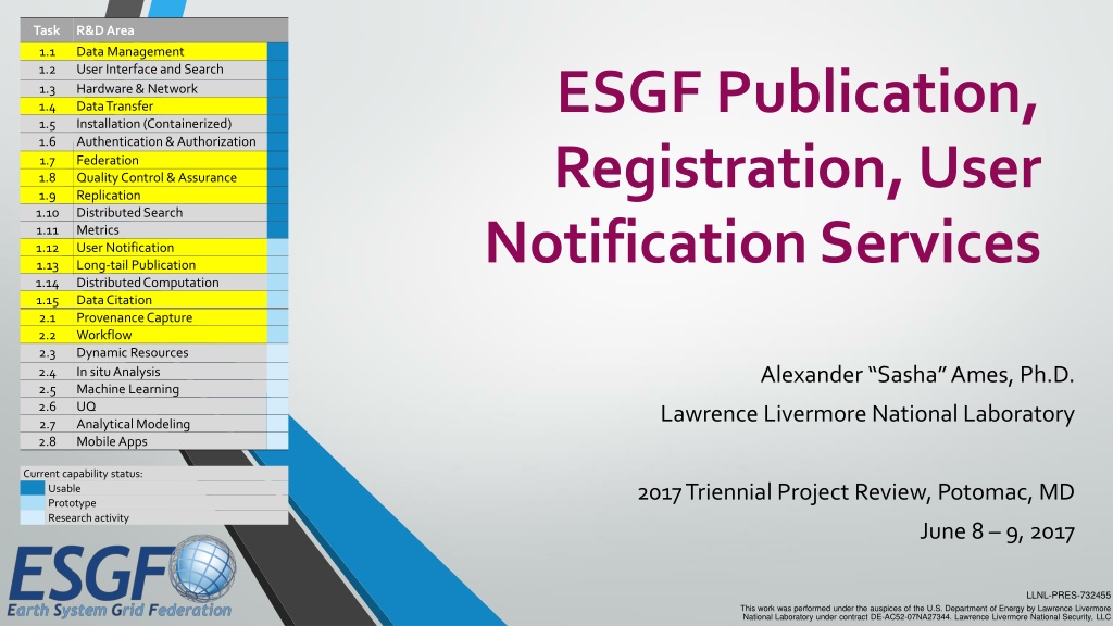Task R&D Area 1.1 1.2 1.3 1.4 1.5 1.6 1.7 1.8 1.9 1.10 1.11 1.12 1.13 1.14 1.15 2.1 2.2 2.3 2.4 2.5 2.6 2.7 2.8 Data Management User Interface and Search Hardware & Network Data Transfer Installation (Containerized) Authentication & Authorization Federation Quality Control & Assurance Replication Distributed Search Metrics User Notification Long-tail Publication Distributed Computation Data Citation Provenance Capture Workflow Dynamic Resources In situ Analysis Machine Learning UQ Analytical Modeling Mobile Apps ESGF Publication, Registration, User Notification Services Alexander Sasha Ames, Ph.D. Lawrence Livermore National Laboratory Current capability status: Usable Prototype Research activity 2017 Triennial Project Review, Potomac, MD June 8 9, 2017 LLNL-PRES-732455 This work was performed under the auspices of the U.S. Department of Energy by Lawrence Livermore National Laboratory under contract DE-AC52-07NA27344. Lawrence Livermore National Security, LLC