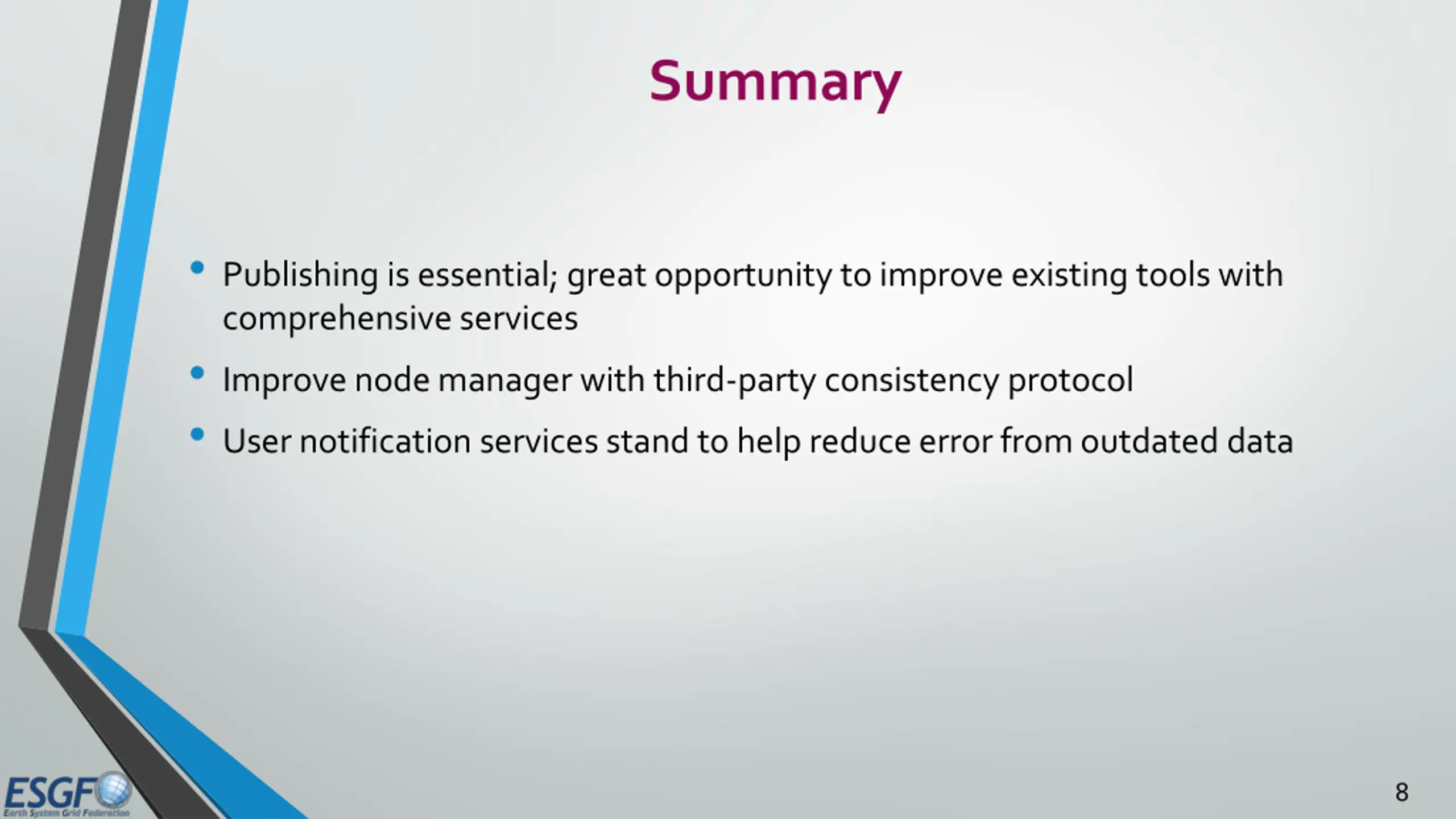 Summary Publishing is essential; great opportunity to improve existing tools with comprehensive services Improve node manager with third-party consistency protocol User notification services stand to help reduce error from outdated data 8