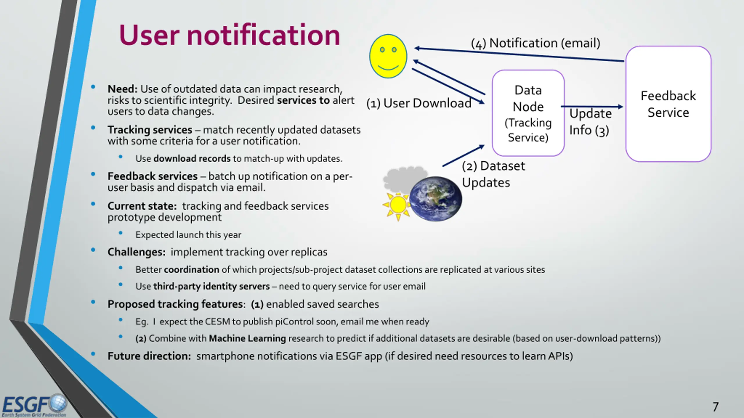 User notification (4) Notification (email) Need: Use of outdated data can impact research, risks to scientific integrity. Desired services to alert users to data changes. Data Node (Tracking Service) Feedback Service (1) User Download Update Info (3) Tracking services match recently updated datasets with some criteria for a user notification. Use download records to match-up with updates. (2) Dataset Updates Feedback services batch up notification on a per- user basis and dispatch via email. Current state: tracking and feedback services prototype development Expected launch this year Challenges: implement tracking over replicas Better coordination of which projects/sub-project dataset collections are replicated at various sites Use third-party identity servers need to query service for user email Proposed tracking features: (1) enabled saved searches Eg. I expect the CESM to publish piControl soon, email me when ready (2) Combine with Machine Learning research to predict if additional datasets are desirable (based on user-download patterns)) Future direction: smartphone notifications via ESGF app (if desired need resources to learn APIs) 7
