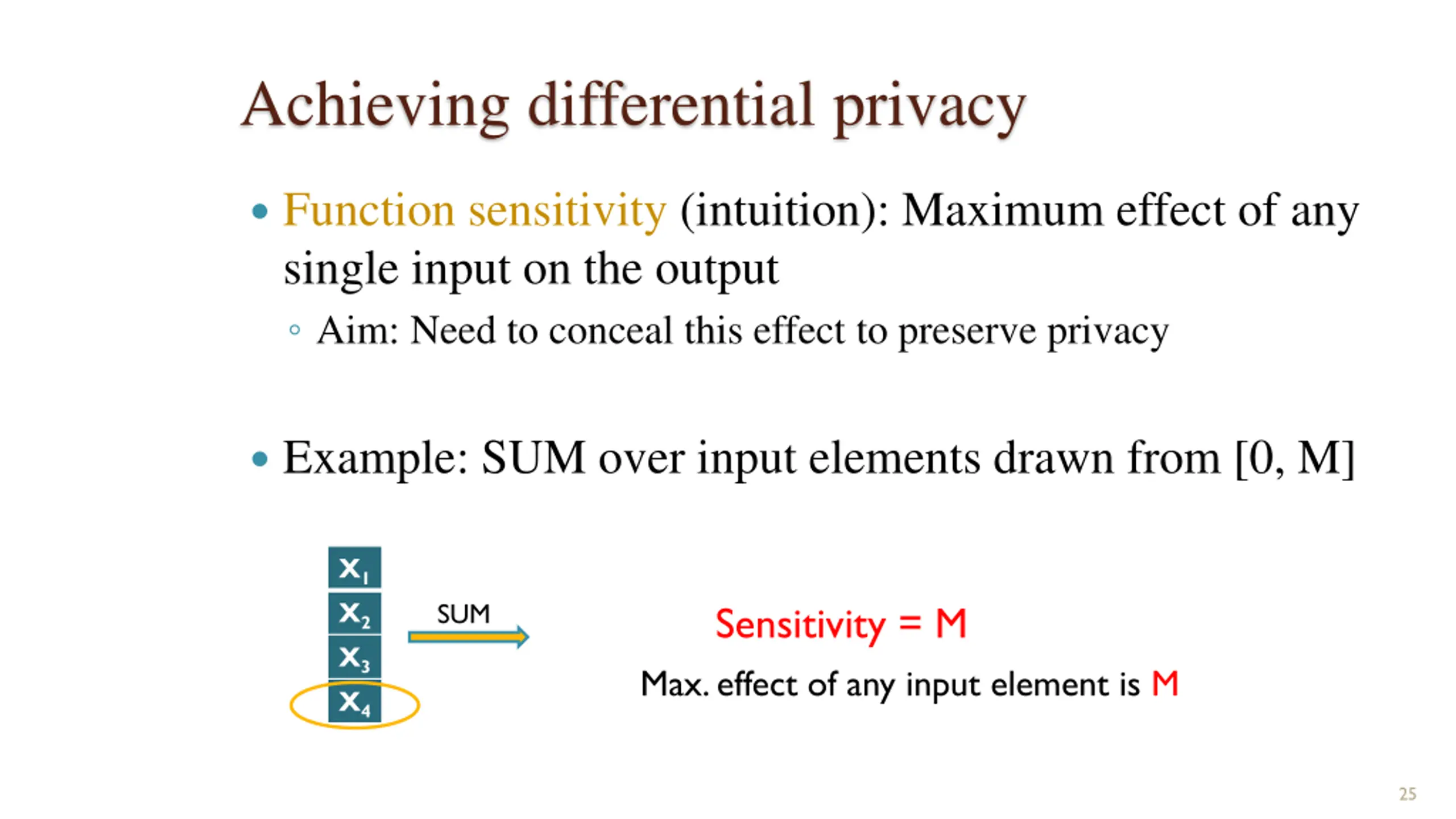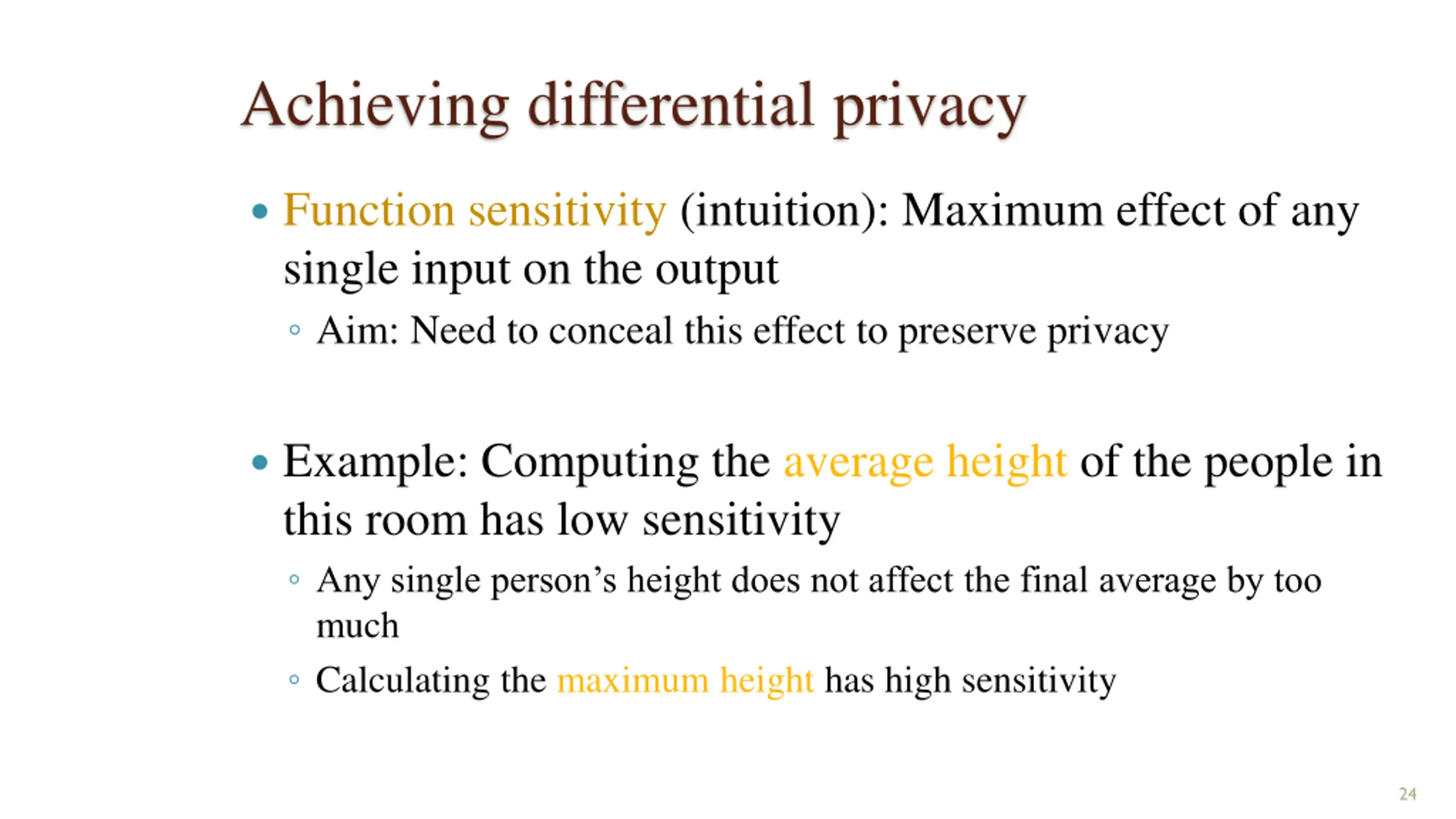 Achieving differential privacy Function sensitivity (intuition): Maximum effect of any single input on the output Aim: Need to conceal this effect to preserve privacy Example: Computing the average height of the people in this room has low sensitivity Any single person s height does not affect the final average by too much Calculating the maximum height has high sensitivity 24