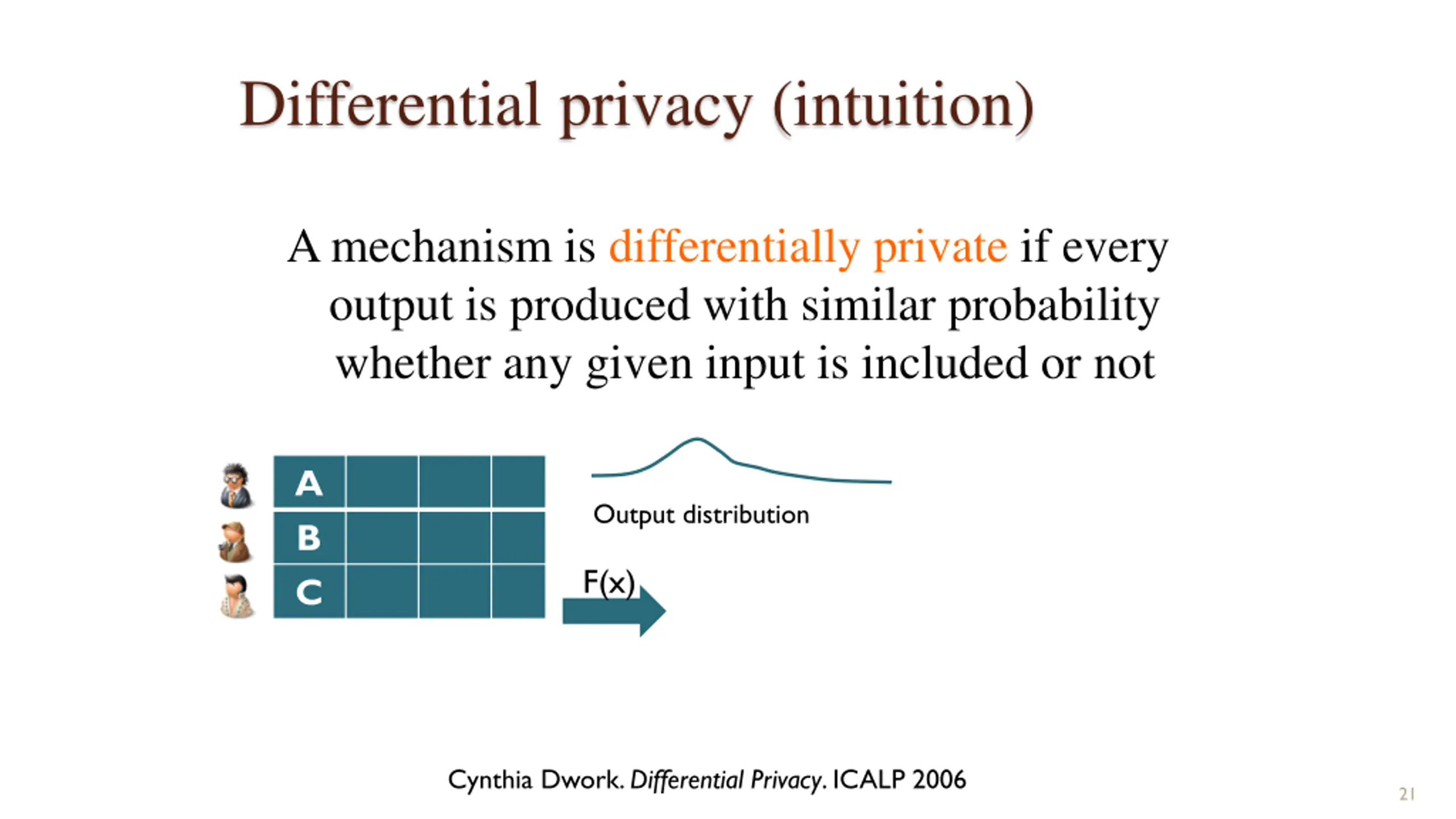 Background: Differential privacy A mechanism is differentially private if every output is produced with similar probability whether any given input is included or not Cynthia Dwork. Differential Privacy. ICALP 2006 20