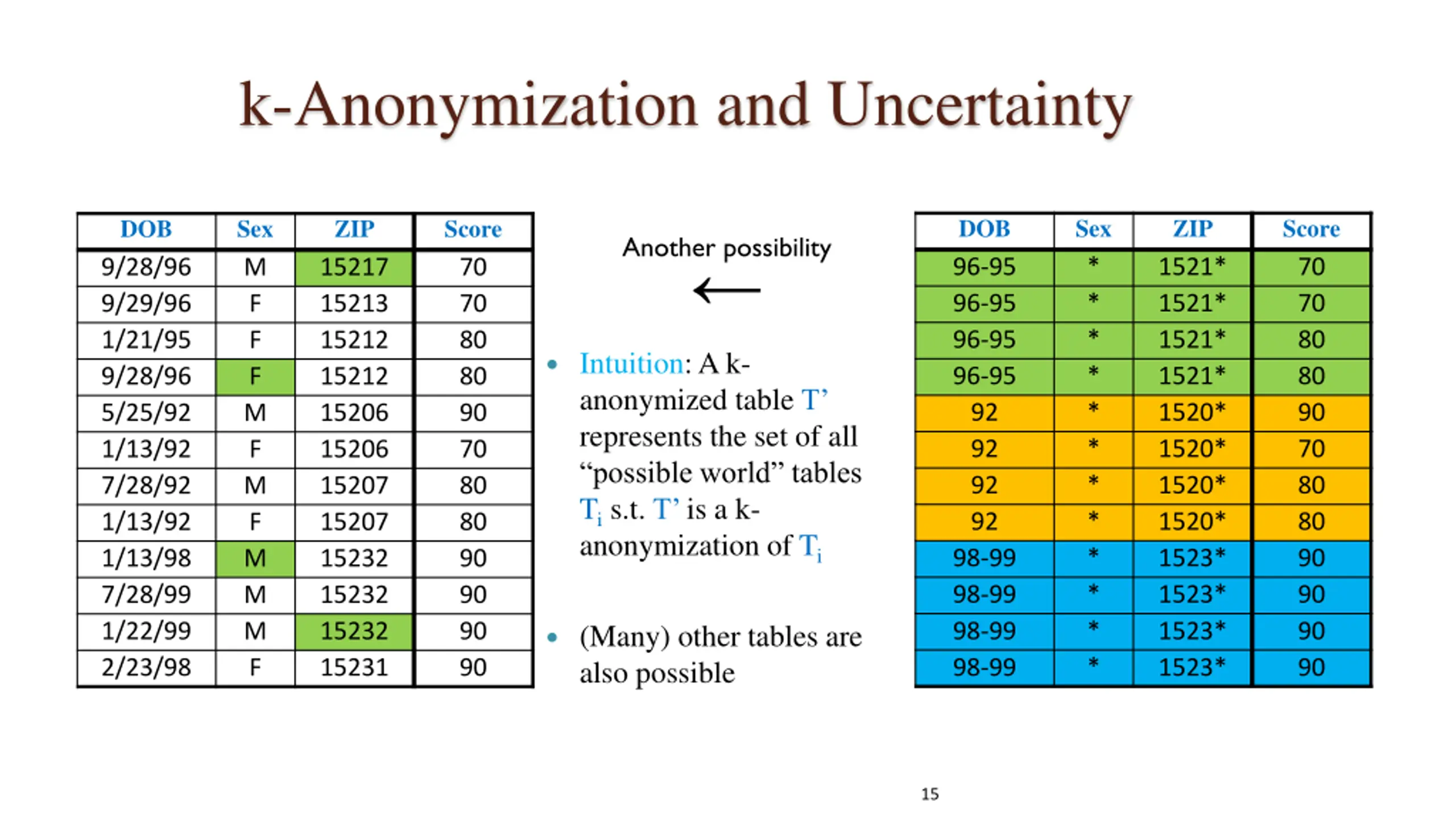 k-Anonymization and Uncertainty DOB 96-95 96-95 96-95 96-95 92 92 92 92 98-99 98-99 98-99 98-99 Sex * * * * * * * * * * * * ZIP 1521* 1521* 1521* 1521* 1520* 1520* 1520* 1520* 1523* 1523* 1523* 1523* Score 70 70 80 80 90 70 80 80 90 90 90 90 DOB 9/28/96 9/29/96 1/21/95 9/28/96 5/25/92 1/13/92 7/28/92 1/13/92 1/13/98 7/28/99 1/22/99 2/23/98 Sex M F F M M F M F F M M F ZIP 15213 15213 15212 15212 15206 15206 15207 15207 15232 15232 15231 15231 Score 70 70 80 80 90 70 80 80 90 90 90 90 One possibility Intuition: A k-anonymized table T represents the set of all possible world tables Ti s.t. T is a k- anonymization of Ti The table T from which T was originally derived is one of the possible worlds 14